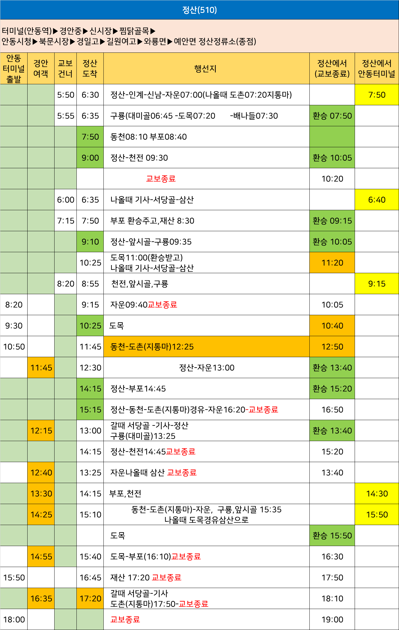 안동 510번: 교보생명 ↔ 안동초교 ↔ 안동시청 ↔ 경일고 ↔ 서지역 ↔ 와룡 ↔ 가구리 ↔ 주계리 ↔ 주진교휴게소 ↔ 삼산 ↔ (배나들 ↔ 서당골 ↔ 기사1리.당산)(아마리)(도목리) ↔ 정산(예안면사무소) ↔ (삼산 ↔ 햇골 ↔ 천전리)(구룡보건진료소 ↔ 원구룡 ↔ 대미골)(태곡리 ↔ 인계 ↔ 삼계 ↔ 고감 ↔ 도촌리.새못)(태곡리 ↔ 인계 ↔ 원학 ↔ 동천리.불미골)(태곡리 ↔ 인계 ↔ 삼계 ↔ 고감 ↔ 신남 ↔ 자운)(태곡리 ↔ 인계 ↔ 삼계 ↔ 고감 ↔ 신남 ↔ 이름실 ↔ 동다리 ↔ 재산버스정류소)