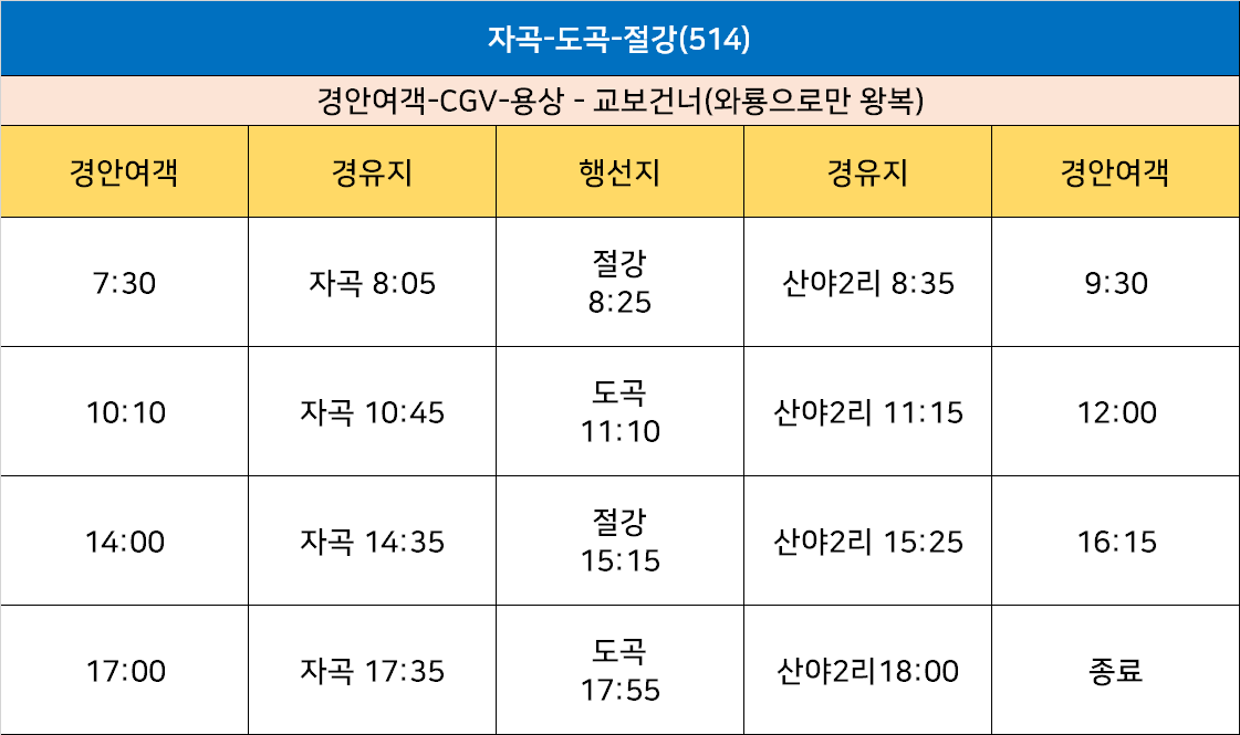안동 514번: 국민건강보험공단 ↔ 낙천교 ↔ 강변펠리시아 ↔ 구안동역 ↔ 교보생명 ↔ 안동초교 ↔ 안동시청 ↔ 경일고 ↔ 서지역 ↔ 와룡 ↔ 가구리 ↔ 산야1리 ↔ 산야2리 ↔ (→ 가류2리.자곡 →) ↔ 도곡.상정 ↔ (절강.박실골)