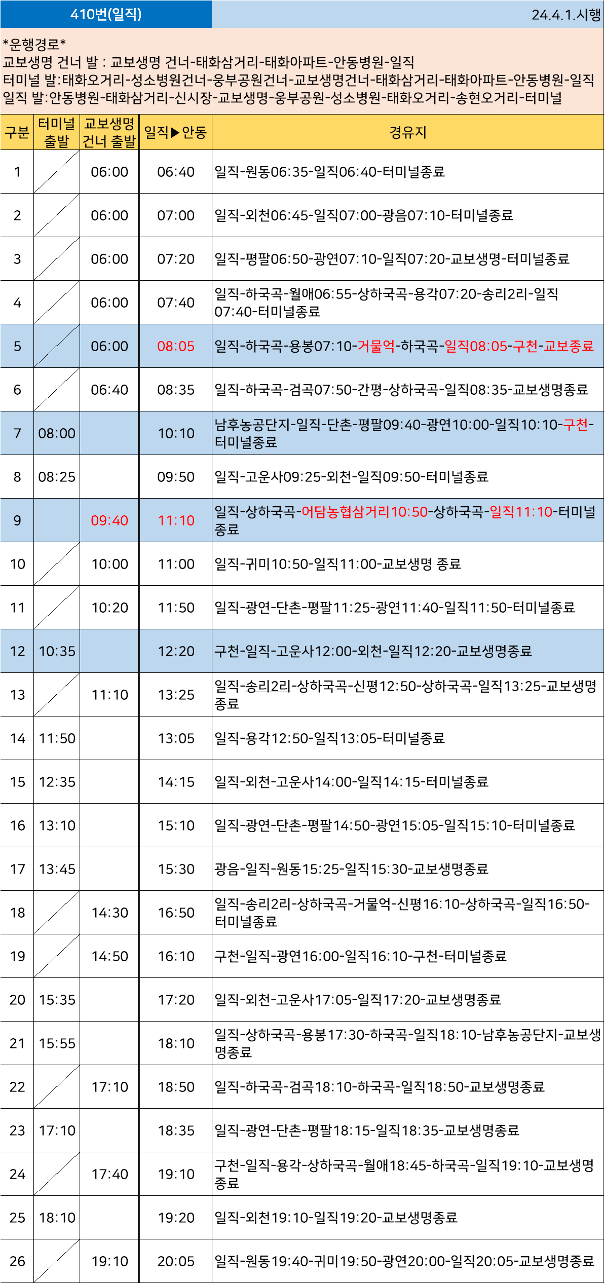 안동 410번: 안동터미널 ↔ 송현오거리 ↔ 태화오거리 ↔ 신시장 ↔ 안동초교 ↔ 교보생명 ↔(구 안동역에서 유턴)영가초교 ↔ 경덕중입구 ↔ 태화우성아파트 ↔ 안동대교 ↔ 안동병원 ↔ 무릉(남후면사무소) ↔ 무릉역 ↔ 여시골입구 ↔ 보현사 ↔ 광음 ↔ (남후농공단지) ↔ (큰광음 ↔ 샛감 ↔ 구큰길) ↔ 원호 ↔ 일직초교 ↔ (구천리) ↔ 일직정류소(운산) ↔ (원리 ↔ 내원)(구.남부초교 ↔ 광연리경로당 ↔ 세촌2리 ↔ 단촌 ↔ 명진2리 ↔ 문화답사촌 ↔ 평팔1리 ↔ 평팔2리)