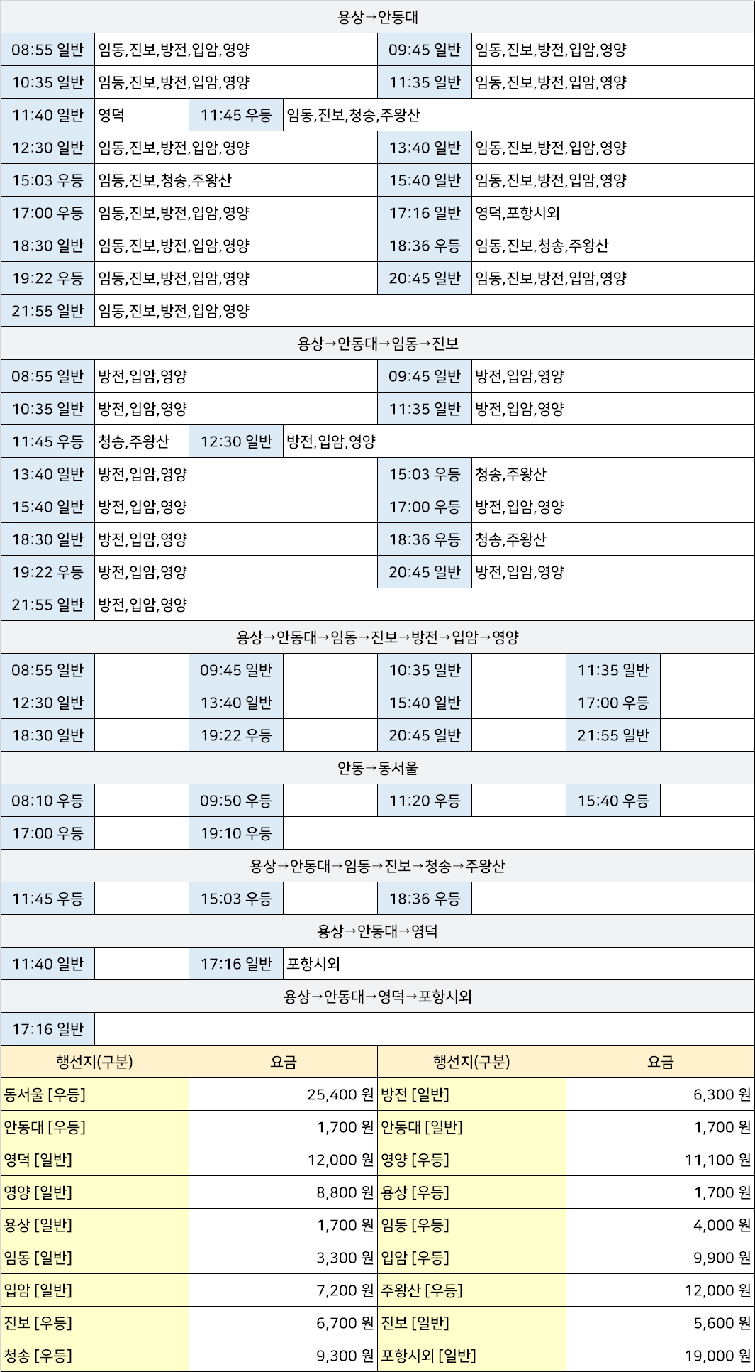 안동초교 시외버스 정류장 시간표/요금표 2025년 06월 13일 기준