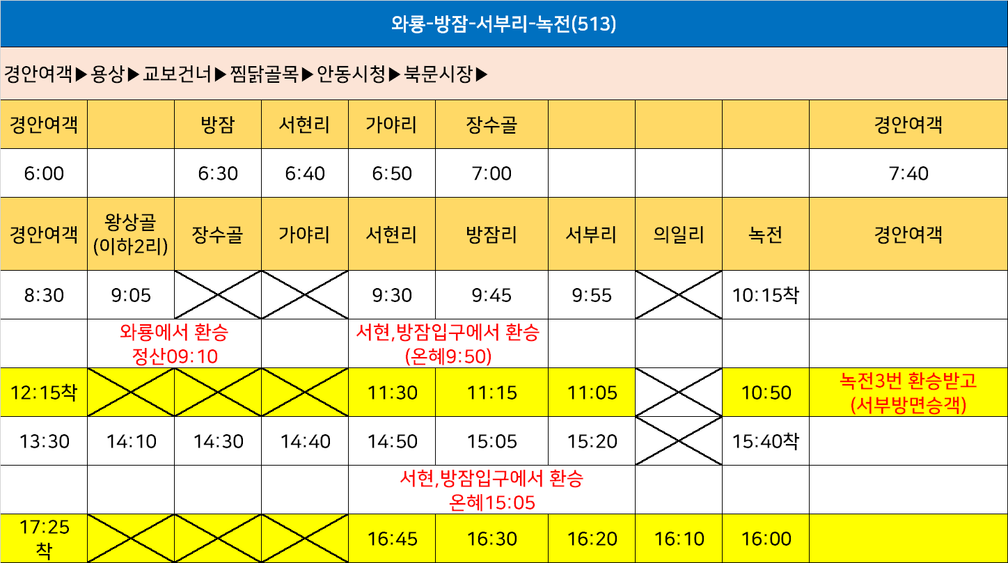 안동 513번: 국민건강보험공단 ↔ 교보생명 ↔ 안동초교 ↔ 안동시청 ↔ 경일고 ↔ 서지역 ↔ 와룡 ↔ (의일리) ↔ 태2리 ↔ 안동소주홍보관 ↔ 지내 ↔ 장수골 ↔ 무르실 ↔ (→ 가야리) ↔ 감애 ↔ (서현리) ↔ 오천 ↔ (방잠) ↔ 서부리 ↔ 광현(뒷송삼거리) ↔ (의일리.제비실) ↔ 구송삼거리 ↔ 신평(녹전면행정복지센터) ↔ 파출소(녹전파출소)