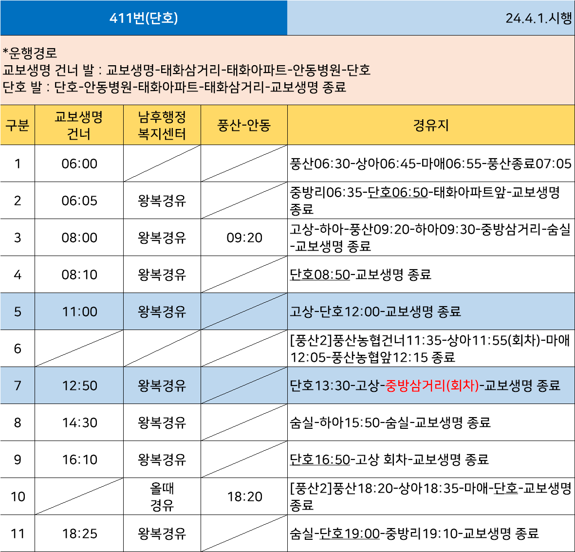 안동 411번(단호): 안동초교 ↔ 신시장 ↔ 무릉(남후면사무소) ↔ 개곡리 ↔ (숨실) ↔ 검암교 ↔ 갈골입구 ↔ (갈골 ↔ 샛터 ↔ 고상 ↔ 중방삼거리 ↔ 고상리종점 ↔ 중방삼거리 ↔ 고상 ↔ 샛터 ↔ 갈골) ↔ 꼬지골 ↔ 단호2리