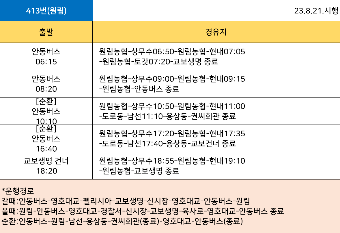 안동 413번(왕복): 안동초교 ↔ 신시장 ↔ 강남파출소 ↔ 안동경찰서 ↔ 강남유치원 ↔ 원림입구 ↔ (원림2리.토갓) ↔ 원림농협 ↔ 와하리 ↔ 상무수 ↔ 와하리 ↔ 원림농협 ↔ 현내1리 ↔ 현내2리