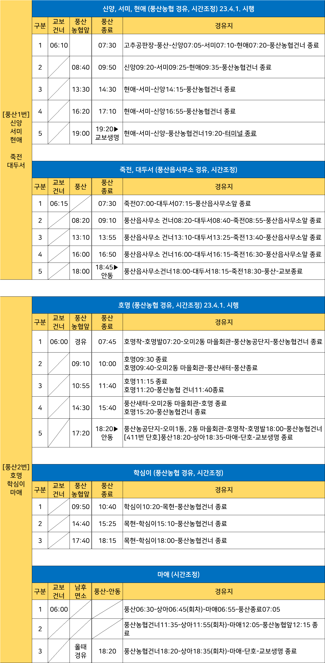 안동 풍산1번(신양-서미-현애): (교보생명 ↔ 안동초교 ↔ 안동중 ↔ 송현오거리 ↔ 안동터미널 ↔ 안동과학대학교 ↔ 서안동IC ↔ 경상북도북부청사) ↔ 풍산정류장 ↔ 풍산읍행정복지센터 ↔ 신양 ↔ 서미 ↔ 현애 ↔ 풍산읍행정복지센터 안동 풍산1번(현애-서미-신양): 풍산정류장 ↔ 풍산읍행정복지센터 ↔ 현애 ↔ 서미 ↔ 신양 ↔ 풍산읍행정복지센터 ↔ 풍산정류장 ↔ (경상북도북부청사 ↔ 서안동IC ↔ 안동과학대학교 ↔ 안동터미널 ↔ 송현오거리 ↔ 안동중 ↔ 안동초교 ↔ 교보생명) 안동 풍산1번(죽전-대두서 첫차): 교보생명 → 안동초교 → 안동중 → 송현오거리 → 안동터미널 → 안동과학대학교 → 서안동IC → 죽전 → 대두서리 → 풍산읍행정복지센터 → 풍산정류장 안동 풍산1번(대두서-죽전): 풍산정류장 ↔ 풍산읍행정복지센터 ↔ 대두서리 ↔ 죽전 ↔ 풍산읍행정복지센터 ↔ 풍산정류장 ↔ (경상북도북부청사 ↔ 서안동IC ↔ 안동과학대학교 ↔ 안동터미널 ↔ 송현오거리 ↔ 안동중 ↔ 안동초교 ↔ 교보생명) 안동 풍산2번: 안동초교 ↔ 안동중 ↔ 송현오거리 ↔ 안동터미널 ↔ 안동과학대학교 ↔ 서안동IC ↔ 경상북도북부청사 ↔ 풍산정류장 ↔ 풍산읍사무소 ↔ 풍산종점 ↔ 국립종자원 ↔ 괴정 ↔ (풍산농공단지) ↔ 오미1리 ↔ (오미1리마을회관) ↔ 오미2리 ↔ 새랄 ↔ (오미2동.본리) ↔ 홍구 ↔ 오성상회 ↔ 오천리(호명면사무소) ↔ (송곡보건진료소 ↔ 송곡리)