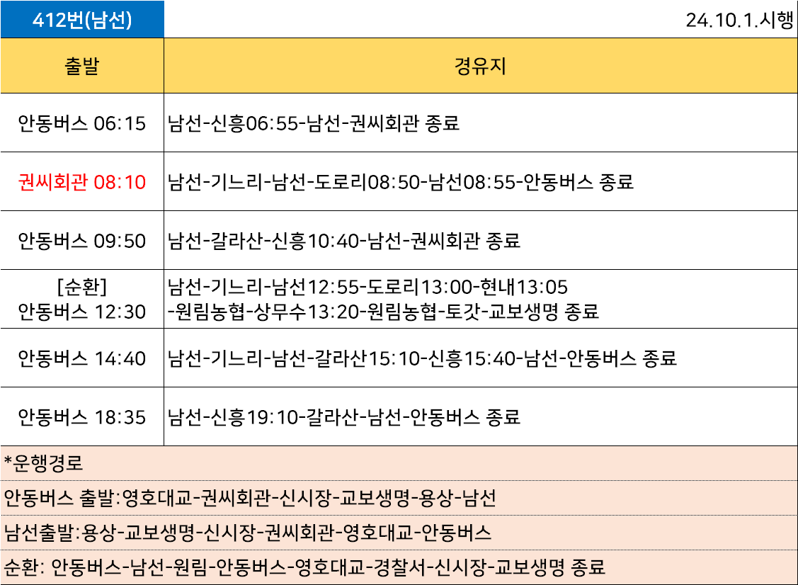 안동 412번: 안동버스차고지 ↔ 권씨회관 ↔ 안동우체국 ↔ 안동초교 ↔ 교보생명 ↔ 구 안동역 ↔ 용상우체국 ↔ 수도사업소입구 ↔ 안동대학교 ↔ 신석1리 ↔ 남선우체국 ↔ (신석2리.기느리 ↔ 남선우체국 ↔ 도로리)(양지말 ↔ 사붓골입구 ↔ (갈라산) ↔ 신흥리) 안동 412번(순환): 안동버스차고지 → 권씨회관 → 안동우체국 → 안동초교 → 교보생명 → 구 안동역 → 용상우체국 → 수도사업소입구 → 안동대학교 → 신석1리 → 남선우체국 → 신석2리.기느리 → 남선우체국 → 도로리 → 돗밤실 → 현내2리 → 현내1리 → 원림농협 → (외하리 → 상무수 → 외하리 → 원림농협) → 원림1리회관 → (원림2리.토갓 → 원림1리회관) → 남례문 → 강남파출소 → 권씨회관 → 안동버스차고지