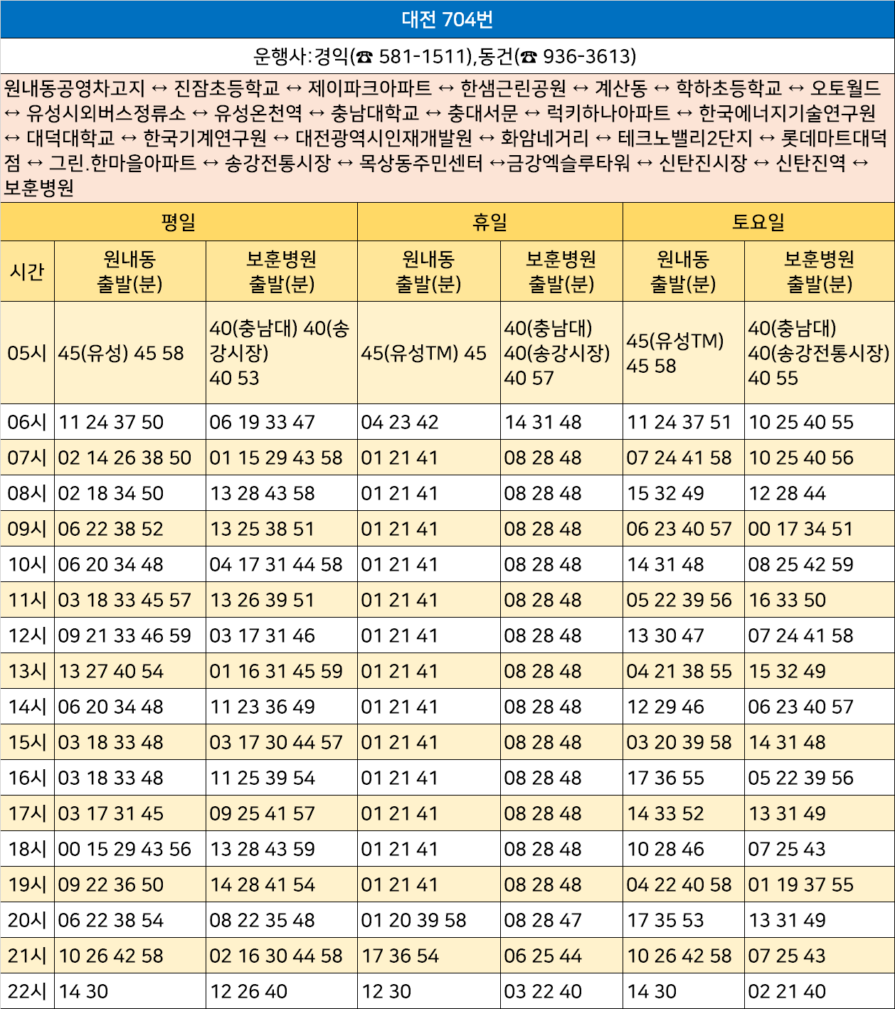 대전 704번: 원내동공영차고지 ↔ 진잠초등학교 ↔ 제이파크아파트 ↔ 한샘근린공원 ↔ 계산동 ↔ 학하초등학교 ↔ 오토월드 ↔ 유성시외버스정류소 ↔ 유성온천역 ↔ 충남대학교 ↔ 충대서문 ↔ 럭키하나아파트 ↔ 한국에너지기술연구원 ↔ 대덕대학교 ↔ 한국기계연구원 ↔ 대전광역시인재개발원 ↔ 화암네거리 ↔ 테크노밸리2단지 ↔ 롯데마트대덕점 ↔ 그린.한마을아파트 ↔ 송강전통시장 ↔ 목상동주민센터 ↔금강엑슬루타워 ↔ 신탄진시장 ↔ 신탄진역 ↔ 보훈병원