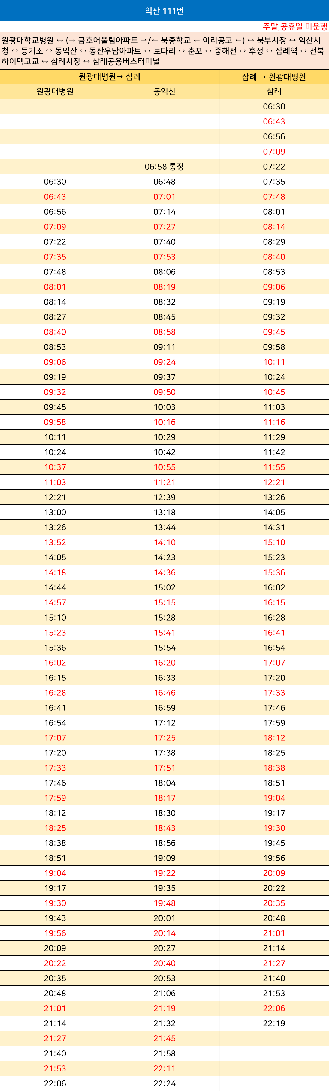 익산 111번: 원광대학교병원 ↔ (→ 금호어울림아파트 →/← 북중학교 ← 이리공고 ←) ↔ 북부시장 ↔ 익산시청 ↔ 등기소 ↔ 동익산 ↔ 동산우남아파트 ↔ 토다리 ↔ 춘포 ↔ 중해전 ↔ 후정 ↔ 삼례역 ↔ 전북하이텍고교 ↔ 삼례시장 ↔ 삼례공용버스터미널