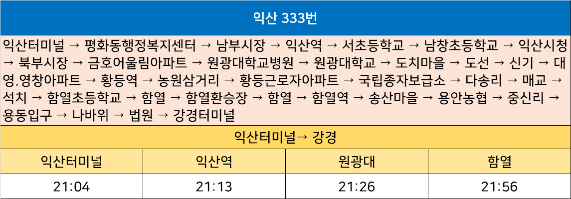 익산 333번: 익산터미널 → 평화동행정복지센터 → 남부시장 → 익산역 → 서초등학교 → 남창초등학교 → 익산시청 → 북부시장 → 금호어울림아파트 → 원광대학교병원 → 원광대학교 → 도치마을 → 도선 → 신기 → 대영.영창아파트 → 황등역 → 농원삼거리 → 황등근로자아파트 → 국립종자보급소 → 다송리 → 매교 → 석치 → 함열초등학교 → 함열 → 함열환승장 → 함열 → 함열역 → 송산마을 → 용안농협 → 중신리 → 용동입구 → 나바위 → 법원 → 강경터미널
