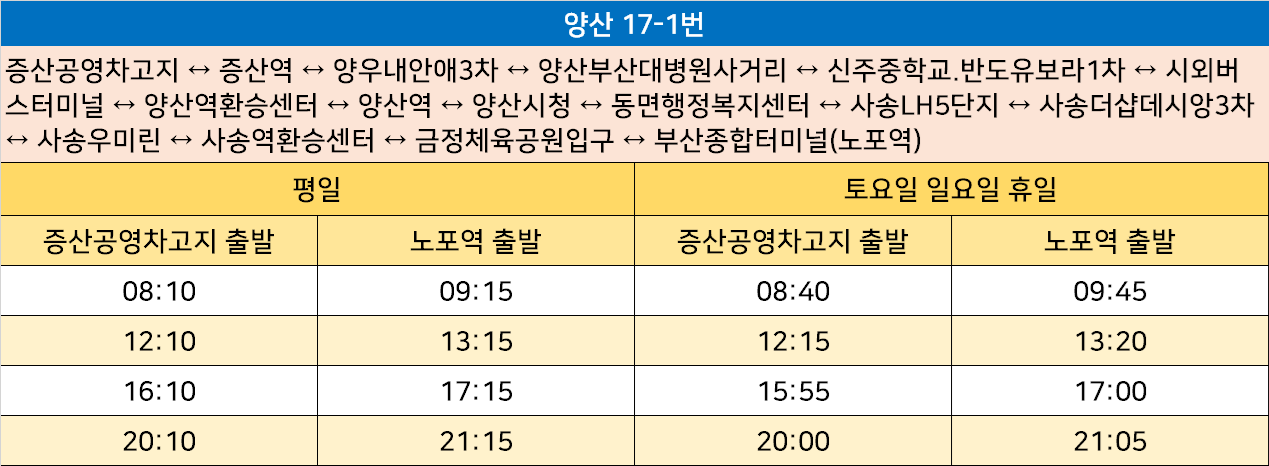 양산 17-1번: 증산공영차고지 ↔ 증산역 ↔ 양우내안애3차 ↔ 양산부산대병원사거리 ↔ 신주중학교.반도유보라1차 ↔ 시외버스터미널 ↔ 양산역환승센터 ↔ 양산역 ↔ 양산시청 ↔ 동면행정복지센터 ↔ 사송LH5단지 ↔ 사송더샵데시앙3차 ↔ 사송우미린 ↔ 사송역환승센터 ↔ 금정체육공원입구 ↔ 부산종합터미널(노포역)