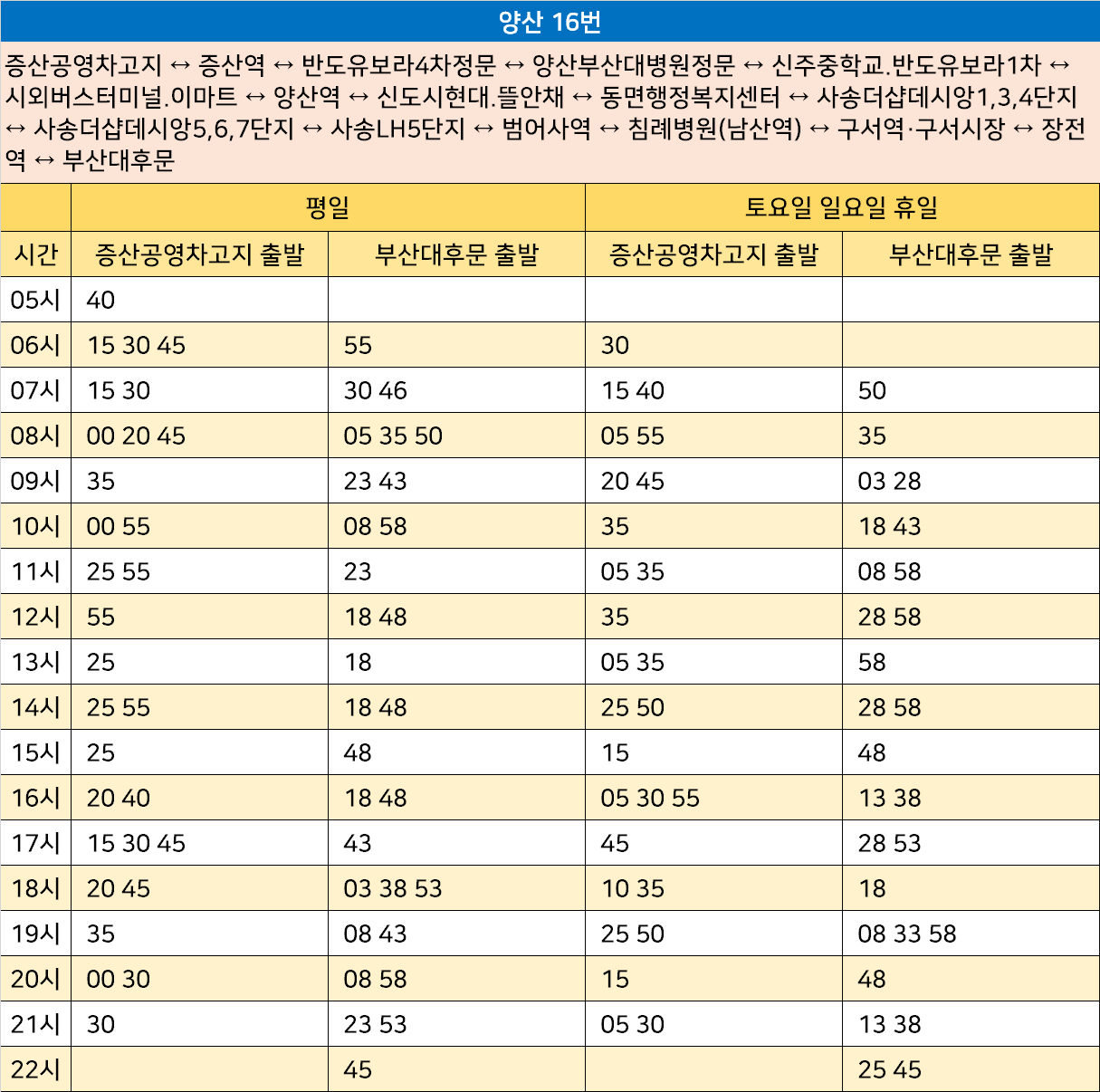 양산 16번: 증산공영차고지 ↔ 증산역 ↔ 반도유보라4차정문 ↔ 양산부산대병원정문 ↔ 신주중학교.반도유보라1차 ↔ 시외버스터미널.이마트 ↔ 양산역 ↔ 신도시현대.뜰안채 ↔ 동면행정복지센터 ↔ 사송더샵데시앙1,3,4단지 ↔ 사송더샵데시앙5,6,7단지 ↔ 사송LH5단지 ↔ 범어사역 ↔ 침례병원(남산역) ↔ 구서역·구서시장 ↔ 장전역 ↔ 부산대후문