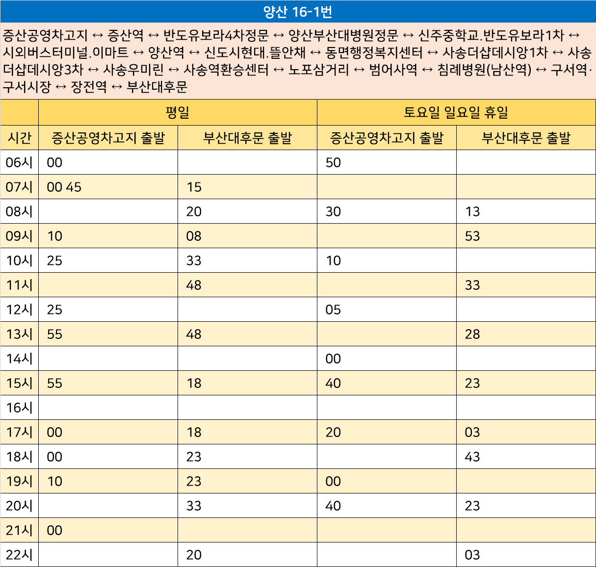 양산 16-1번: 증산공영차고지 ↔ 증산역 ↔ 반도유보라4차정문 ↔ 양산부산대병원정문 ↔ 신주중학교.반도유보라1차 ↔ 시외버스터미널.이마트 ↔ 양산역 ↔ 신도시현대.뜰안채 ↔ 동면행정복지센터 ↔ 사송더샵데시앙1차 ↔ 사송더샵데시앙3차 ↔ 사송우미린 ↔ 사송역환승센터 ↔ 노포삼거리 ↔ 범어사역 ↔ 침례병원(남산역) ↔ 구서역·구서시장 ↔ 장전역 ↔ 부산대후문