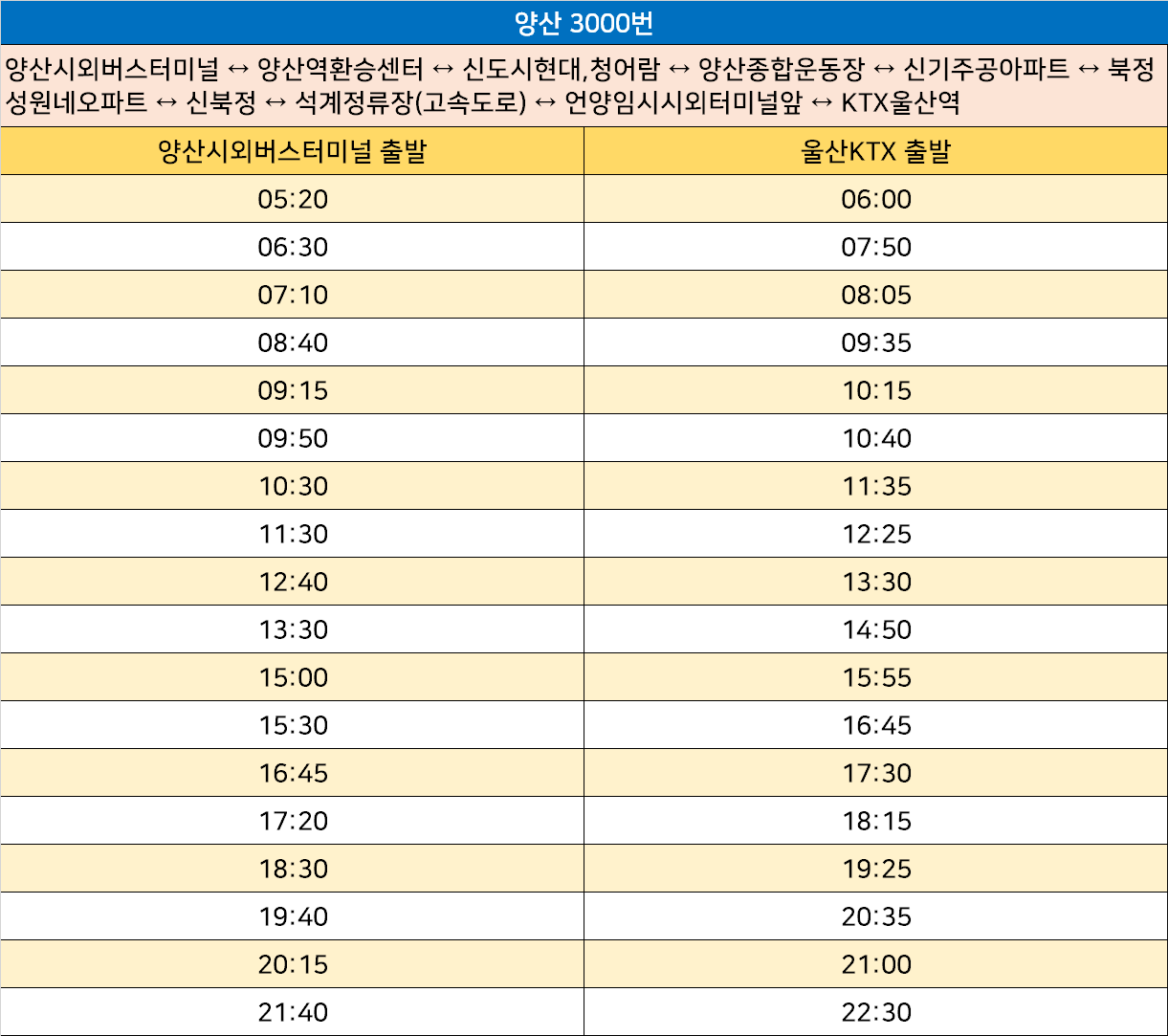 양산 3000번: 양산시외버스터미널 ↔ 양산역환승센터 ↔ 신도시현대,청어람 ↔ 양산종합운동장 ↔ 신기주공아파트 ↔ 북정성원네오파트 ↔ 신북정 ↔ 석계정류장(고속도로) ↔ 언양임시시외터미널앞 ↔ KTX울산역