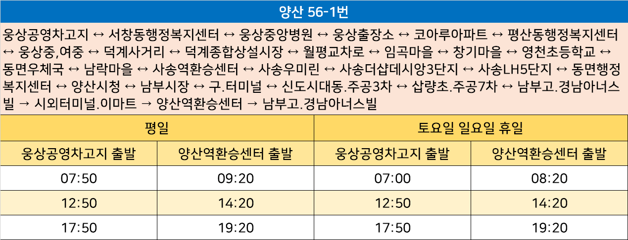 양산 56-1번: 웅상공영차고지 ↔ 서창동행정복지센터 ↔ 웅상중앙병원 ↔ 웅상출장소 ↔ 코아루아파트 ↔ 평산동행정복지센터 ↔ 웅상중,여중 ↔ 덕계사거리 ↔ 덕계종합상설시장 ↔ 월평교차로 ↔ 임곡마을 ↔ 창기마을 ↔ 영천초등학교 ↔ 동면우체국 ↔ 남락마을 ↔ 사송역환승센터 ↔ 사송우미린 ↔ 사송더샵데시앙3단지 ↔ 사송LH5단지 ↔ 동면행정복지센터 ↔ 양산시청 ↔ 남부시장 ↔ 구.터미널 ↔ 신도시대동.주공3차 ↔ 삽량초.주공7차 ↔ 남부고.경남아너스빌 → 시외터미널.이마트 → 양산역환승센터 → 남부고.경남아너스빌