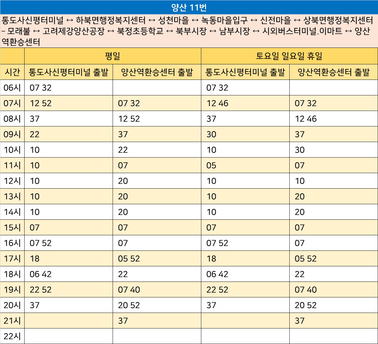 양산 11번: 통도사신평터미널 ↔ 하북면행정복지센터 ↔ 성천마을 ↔ 녹동마을입구 ↔ 신전마을 ↔ 상북면행정복지센터 – 모래불 ↔ 고려제강양산공장 ↔ 북정초등학교 ↔ 북부시장 ↔ 남부시장 ↔ 시외버스터미널.이마트 ↔ 양산역환승센터