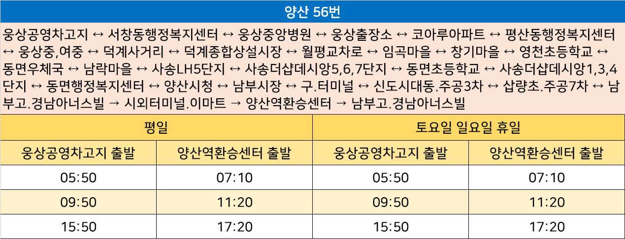 양산 56번: 웅상공영차고지 ↔ 서창동행정복지센터 ↔ 웅상중앙병원 ↔ 웅상출장소 ↔ 코아루아파트 ↔ 평산동행정복지센터 ↔ 웅상중,여중 ↔ 덕계사거리 ↔ 덕계종합상설시장 ↔ 월평교차로 ↔ 임곡마을 ↔ 창기마을 ↔ 영천초등학교 ↔ 동면우체국 ↔ 남락마을 ↔ 사송LH5단지 ↔ 사송더샵데시앙5,6,7단지 ↔ 동면초등학교 ↔ 사송더샵데시앙1,3,4단지 ↔ 동면행정복지센터 ↔ 양산시청 ↔ 남부시장 ↔ 구.터미널 ↔ 신도시대동.주공3차 ↔ 삽량초.주공7차 ↔ 남부고.경남아너스빌 → 시외터미널.이마트 → 양산역환승센터 → 남부고.경남아너스빌