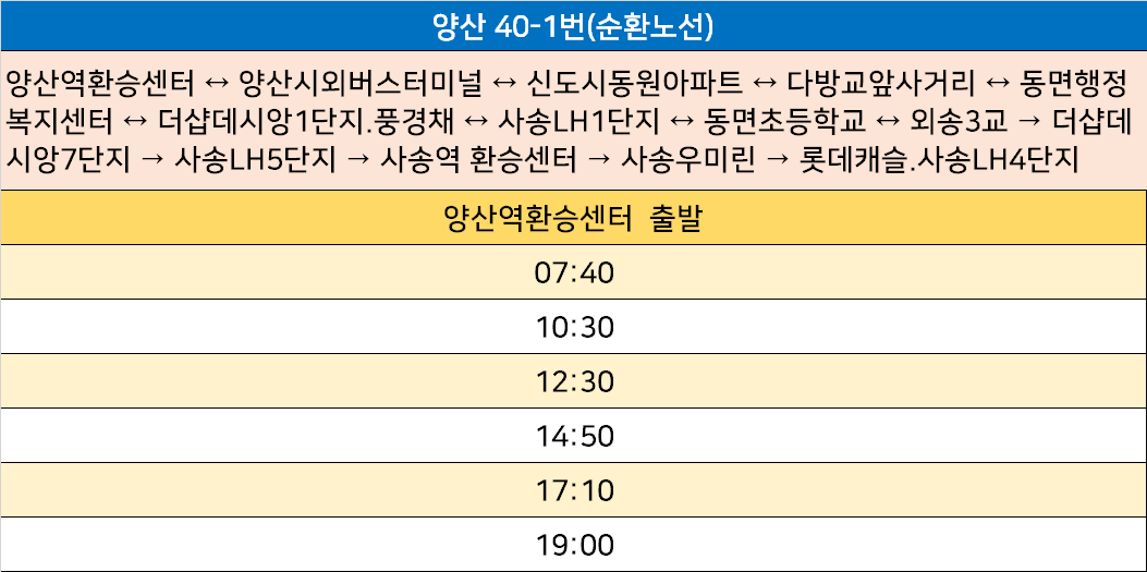 양산 40-1번: 양산역환승센터 ↔ 양산시외버스터미널 ↔ 신도시동원아파트 ↔ 다방교앞사거리 ↔ 동면행정복지센터 ↔ 더샵데시앙1단지.풍경채 ↔ 사송LH1단지 ↔ 동면초등학교 ↔ 외송3교 → 더샵데시앙7단지 → 사송LH5단지 → 사송역 환승센터 → 사송우미린 → 롯데캐슬.사송LH4단지