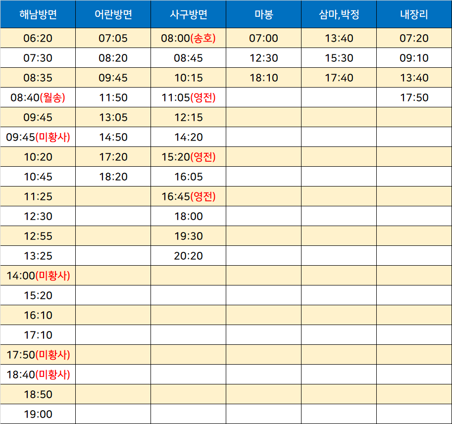 산정터미널 노선정보: 해남, 어란, 사구, 마봉, 삼마, 박정, 내장리, 월송, 미황사, 송호, 영전
