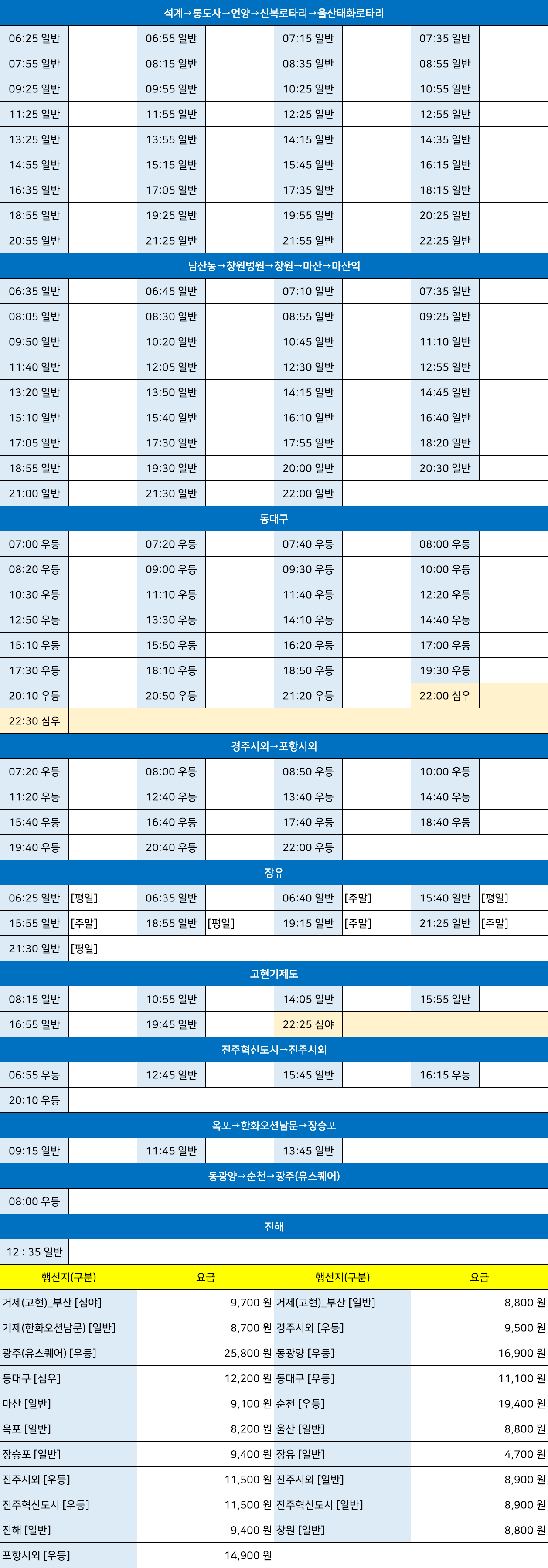 김해공항시외고속버스정류소 김해공항정류장 김해공항터미널 → "경주시외→포항시외,고현거제도,남산동→창원병원→창원→마산→마산역,동광양→순천→광주(유스퀘어),동대구,석계→통도사→언양→신복로타리→울산태화로타리,옥포→한화오션남문→장승포,장유,진주혁신도시→진주시외,진해".
