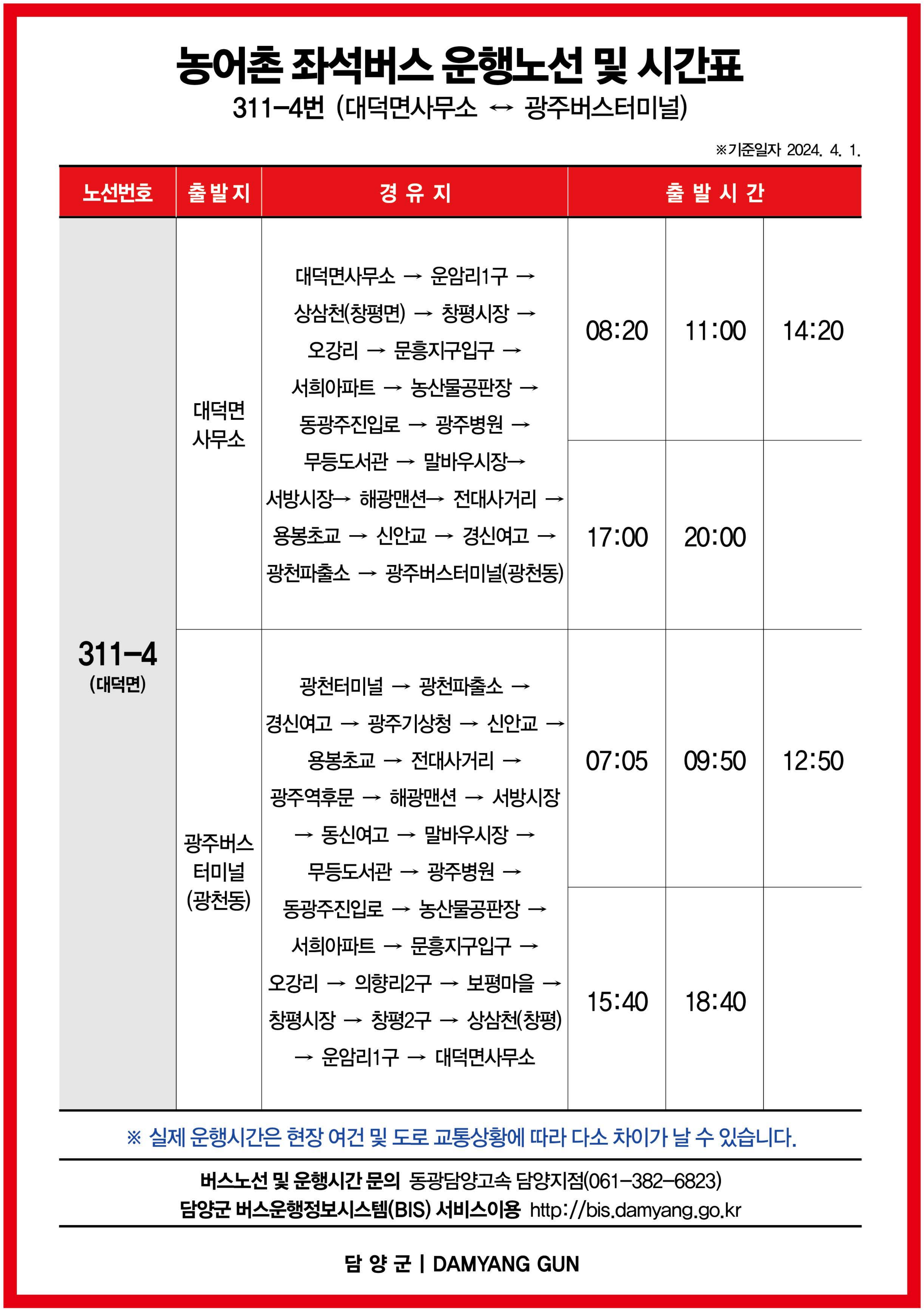 담양군 311-4번: 대덕면사무소 → 운암리1구 → 상삼천(창평면) → 창평시장 → 오강리 → 문흥지구입구 → 서희아파트 → 농산물공판장 → 동광주진입로 → 광주병원 → 무등도서관 → 말바우시장→ 서방시장→ 해광맨션→ 전대사거리 → 용봉초교 → 신안교 → 경신여고 → 광천파출소 → 광주버스터미널(광천동) / 광천터미널 → 광천파출소 → 경신여고 → 광주기상청 → 신안교 → 용봉초교 → 전대사거리 → 광주역후문 → 해광맨션 → 서방시장 → 동신여고 → 말바우시장 → 무등도서관 → 광주병원 → 동광주진입로 → 농산물공판장 → 서희아파트 → 문흥지구입구 → 오강리 → 의향리2구 → 보평마을 → 창평시장 → 창평2구 → 상삼천(창평) → 운암리1구 → 대덕면사무소