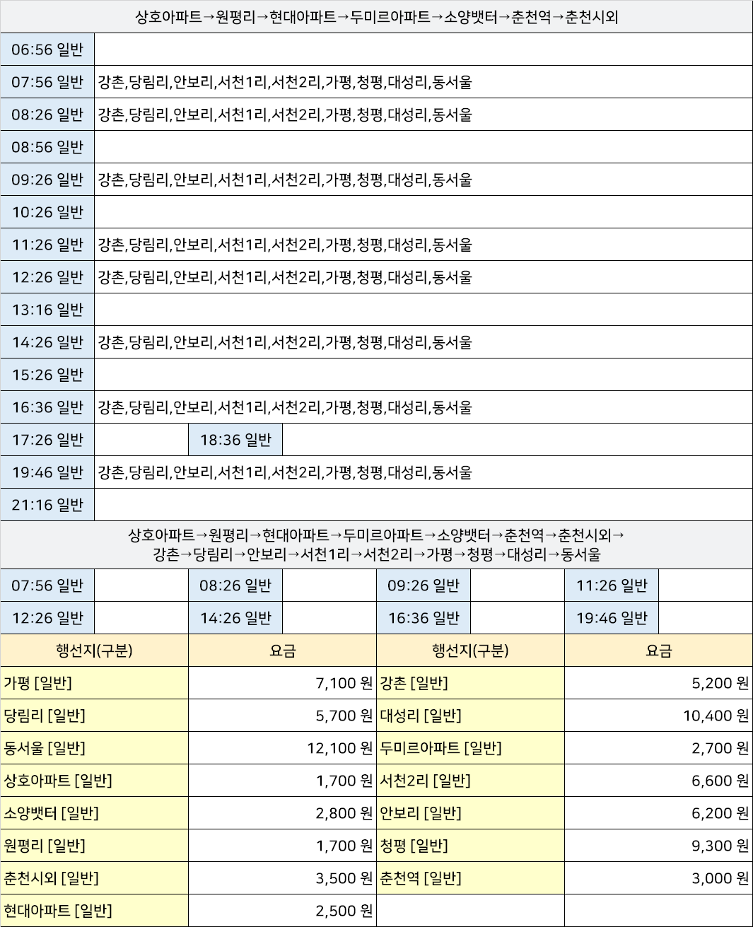 신포리시외고속버스터미널 신포리정류장 신포리정류소 → "상호아파트→원평리→현대아파트→두미르아파트→소양뱃터→춘천역→춘천시외→강촌→당림리→안보리→서천1리→서천2리→가평→청평→대성리→동서울".