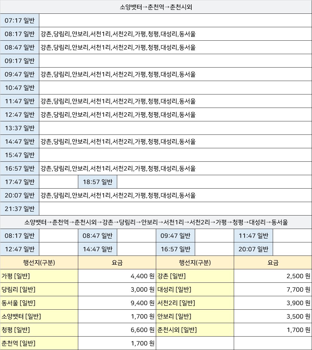 두미르아파트시외고속버스터미널 두미르아파트정류장 두미리아파트정류소 → "소양뱃터→춘천역→춘천시외→강촌→당림리→안보리→서천1리→서천2리→가평→청평→대성리→동서울".