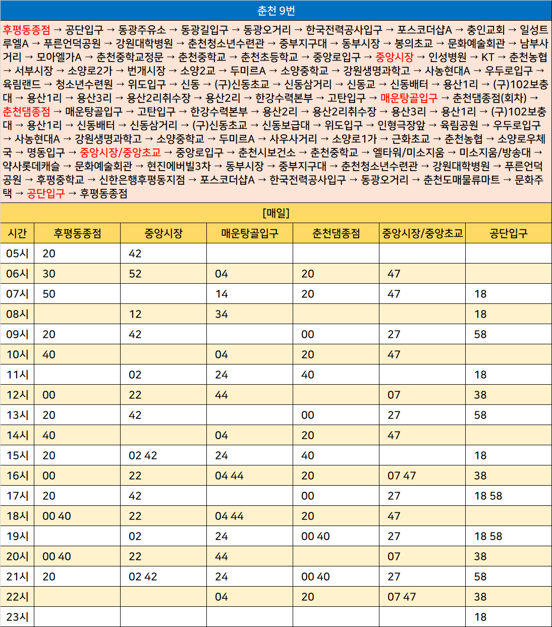 | 소양강처녀상 호반환승센터 소양로배터 시외고속버스터미널 시간표 [호반환승센터정류장 소양로배터정류장] (0) | 2025.05.02 |