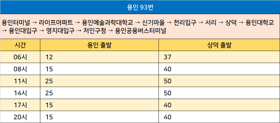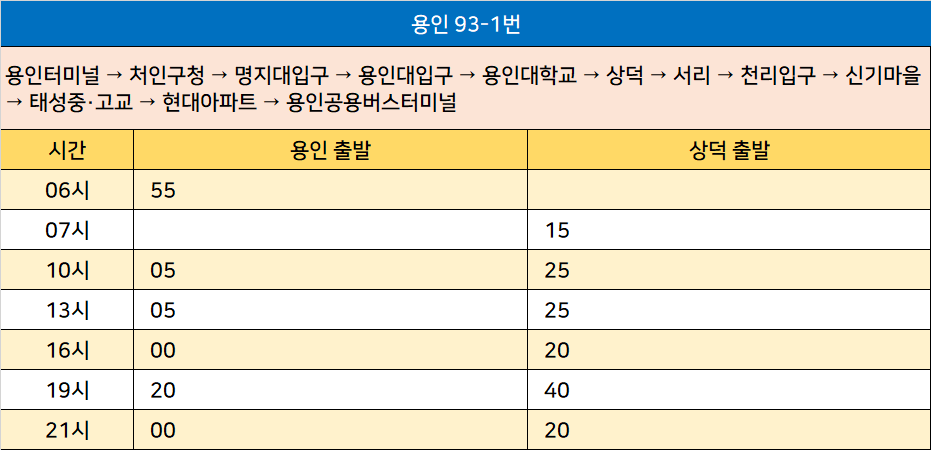 용인 93-1번: 용인터미널 → 처인구청 → 명지대입구 → 용인대입구 → 용인대학교 → 상덕 → 서리 → 천리입구 → 신기마을 → 태성중·고교 → 현대아파트 → 용인공용버스터미널