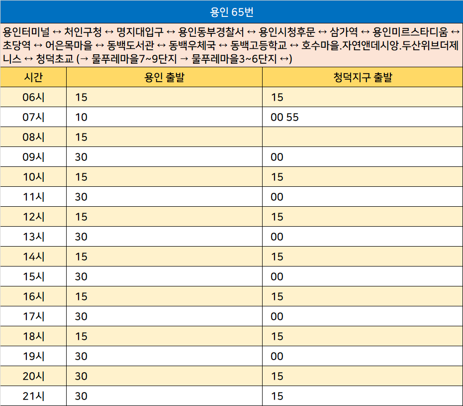 용인 65번: 용인터미널 ↔ 처인구청 ↔ 명지대입구 ↔ 용인동부경찰서 ↔ 용인시청후문 ↔ 삼가역 ↔ 용인미르스타디움 ↔ 초당역 ↔ 어은목마을 ↔ 동백도서관 ↔ 동백우체국 ↔ 동백고등학교 ↔ 호수마을.자연앤데시앙.두산위브더제니스 ↔ 청덕초교 (→ 물푸레마을7~9단지 → 물푸레마을3~6단지 ↔)