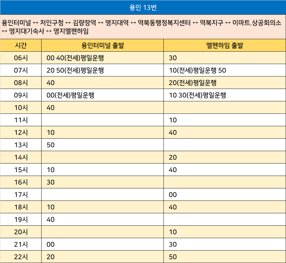 용인 13번: 용인터미널 ↔ 처인구청 ↔ 김량장역 ↔ 명지대역 ↔ 역북동행정복지센터 ↔ 역북지구 ↔ 이마트.상공회의소 ↔ 명지대기숙사 ↔ 명지엘펜하임