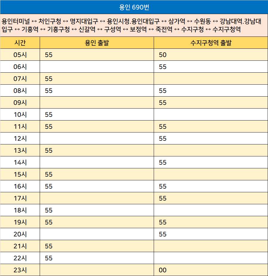 용인 690번: 용인터미널 ↔ 처인구청 ↔ 명지대입구 ↔ 용인시청.용인대입구 ↔ 삼가역 ↔ 수원동 ↔ 강남대역.강남대입구 ↔ 기흥역 ↔ 기흥구청 ↔ 신갈역 ↔ 구성역 ↔ 보정역 ↔ 죽전역 ↔ 수지구청 ↔ 수지구청역