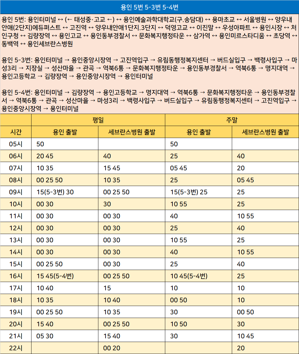 용인 5번: 용인터미널 ↔ (← 태성중·고교 ←) ↔ 용인예술과학대학교(구.송담대) ↔ 용마초교 ↔ 서울병원 ↔ 양우내안애(2단지)에듀퍼스트 ↔ 고진역 ↔ 양우내안애1단지.3단지 ↔ 덕영고교 ↔ 이진말 ↔ 우성아파트 ↔ 용인시장 ↔ 처인구청 ↔ 김량장역 ↔ 용인고교 ↔ 용인동부경찰서 ↔ 문화복지행정타운 ↔ 삼가역 ↔ 용인미르스타디움 ↔ 초당역 ↔ 동백역 ↔ 용인세브란스병원