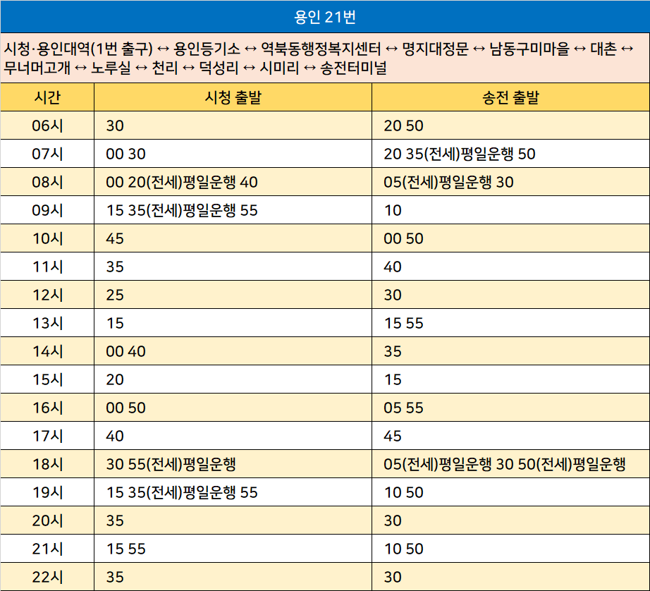 용인 21번: 시청·용인대역(1번 출구) ↔ 용인등기소 ↔ 역북동행정복지센터 ↔ 명지대정문 ↔ 남동구미마을 ↔ 대촌 ↔ 무너머고개 ↔ 노루실 ↔ 천리 ↔ 덕성리 ↔ 시미리 ↔ 송전터미널