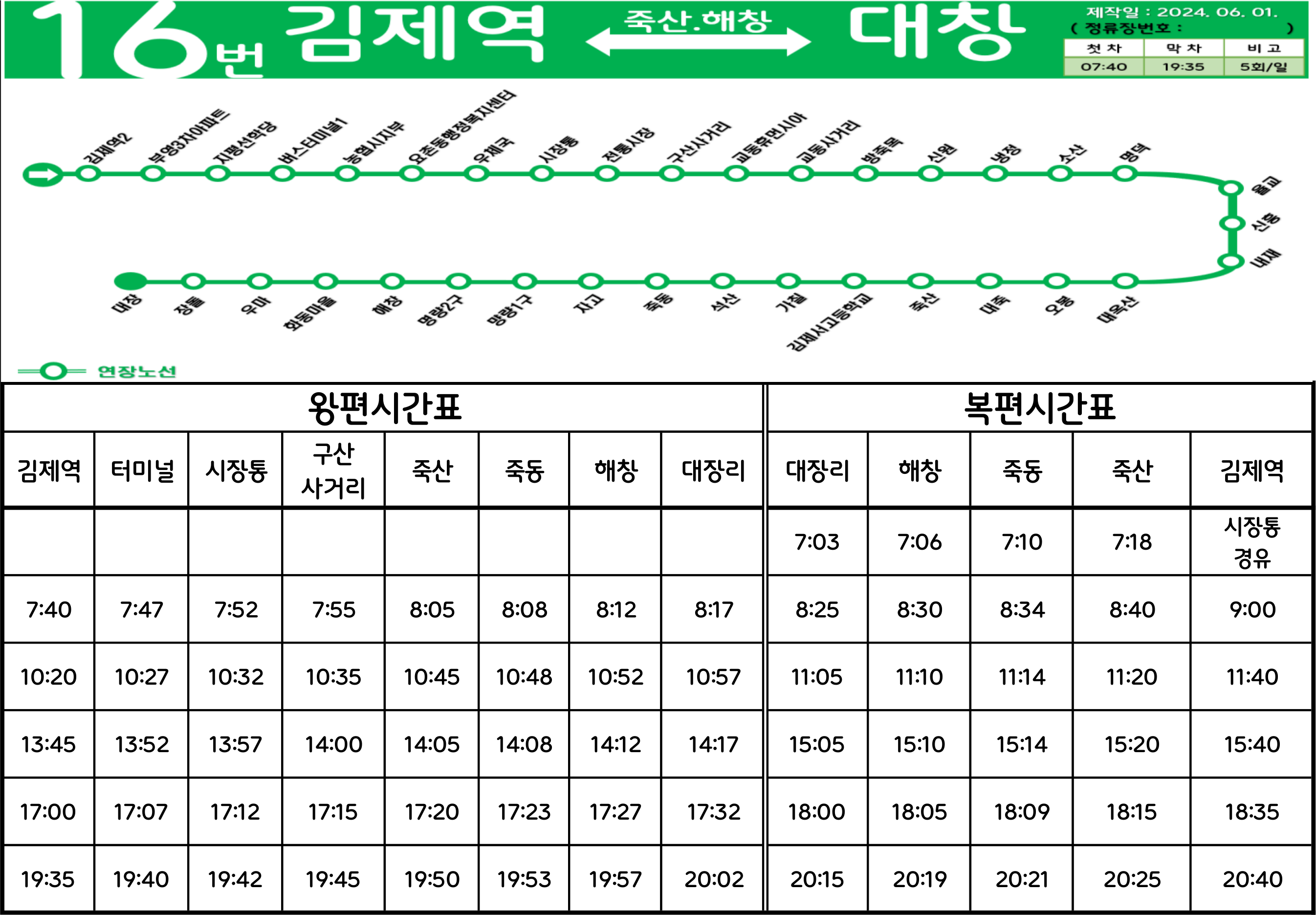 김제 16번: 김제역 ↔ (→ 부영3차아파트 → 김제공용버스터미널 → 김제우체국 → 시장통 →/← 한국농어촌공사 ← 금만사거리 ←) ↔ 구산사거리 ↔ 중앙병원 ↔ 교동사거리 ↔ 냉정 ↔ 소산 ↔ 신흥 ↔ 죽산삼거리 ↔ 죽산면사무소 ↔ 죽동.자고 ↔ 명량1구 ↔ 해창 ↔ 화동 ↔ 장돌 ↔ 대장