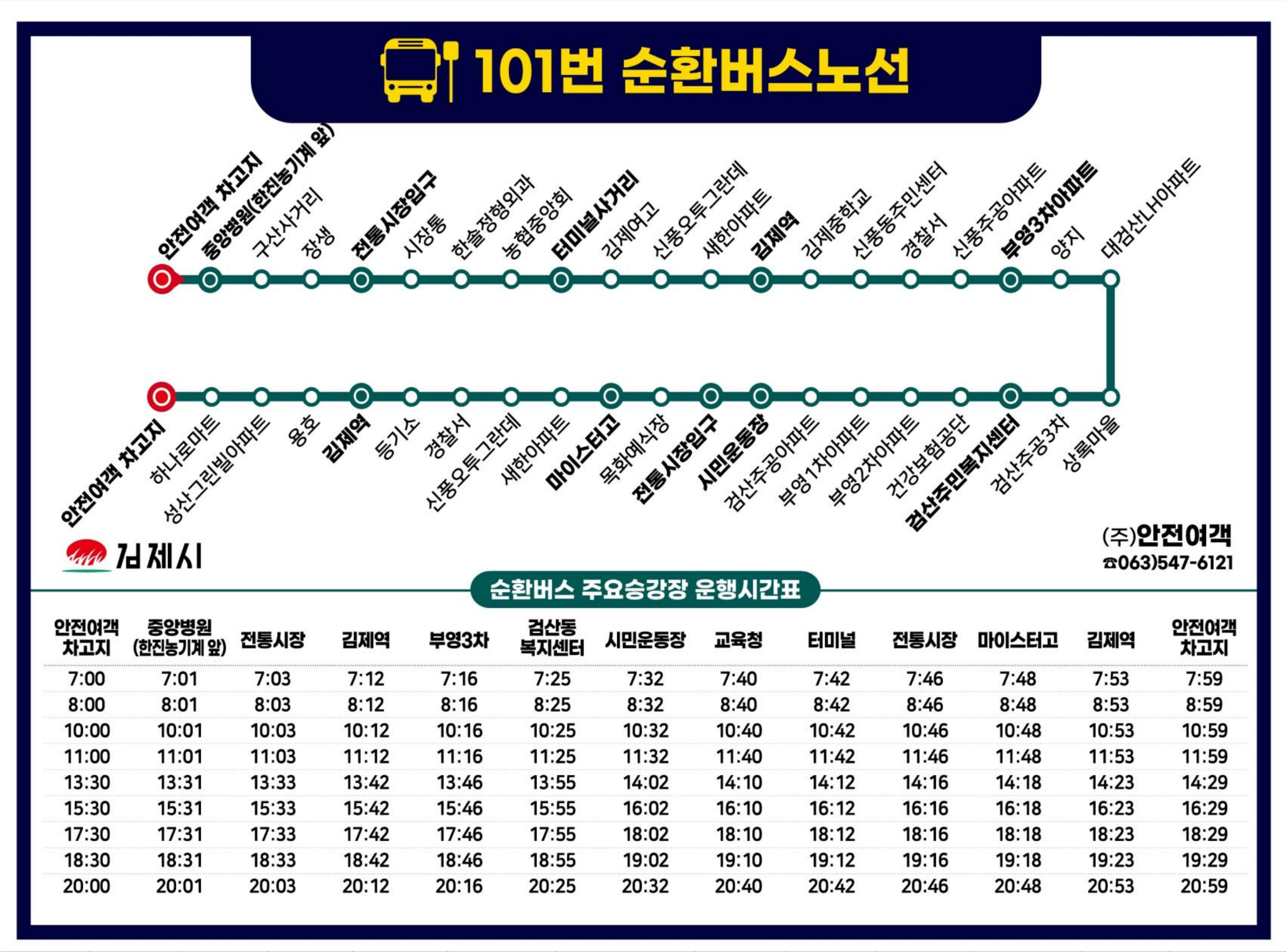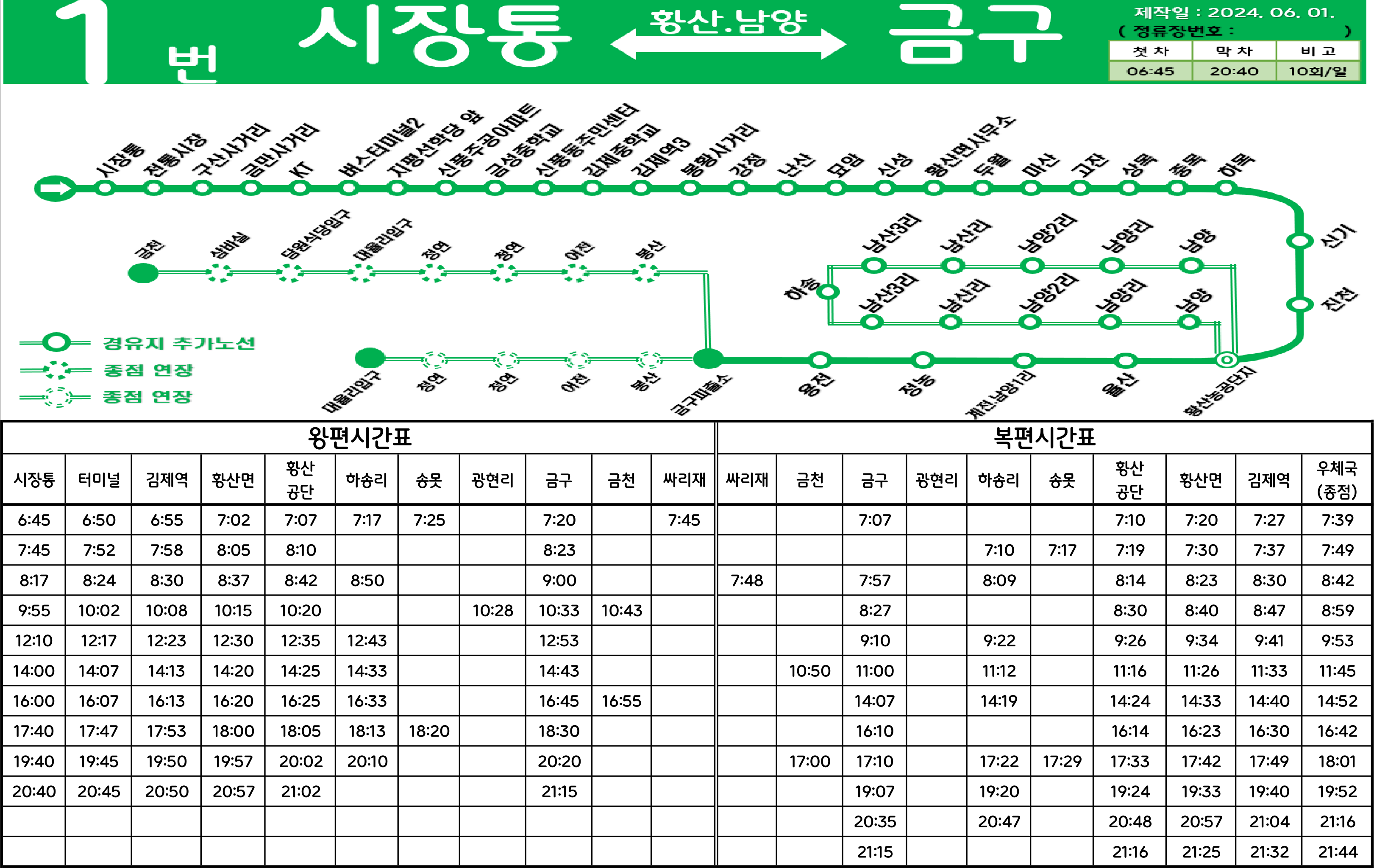 김제 1번: 시장통 ↔ (→ 구산사거리 → 김제공용버스터미널 → 신풍주공아파트 → 김제역 → 부영3차아파트 → 검산휴먼시아 →/← 김제우체국 ← 전화국 ← 시립도서관 ← 김제역 ← 봉황사거리 ←) ↔ 황산면사무소 ↔ 상목 ↔ 황산농공단지 ↔ 남양1리.개전 ↔ (남양1리 ↔ 남양2리.남산 ↔ 하송 ↔ 남양2리.남산 ↔ 남양1리)(남양1리 ↔ 송못 ↔ 남양1리) ↔ 옥사동 ↔ (사동 ↔ 광현 ↔ 우산리) ↔ 금구 ↔ (선암저수지 ↔ 축령.싸리재)(어전 ↔ 금천)