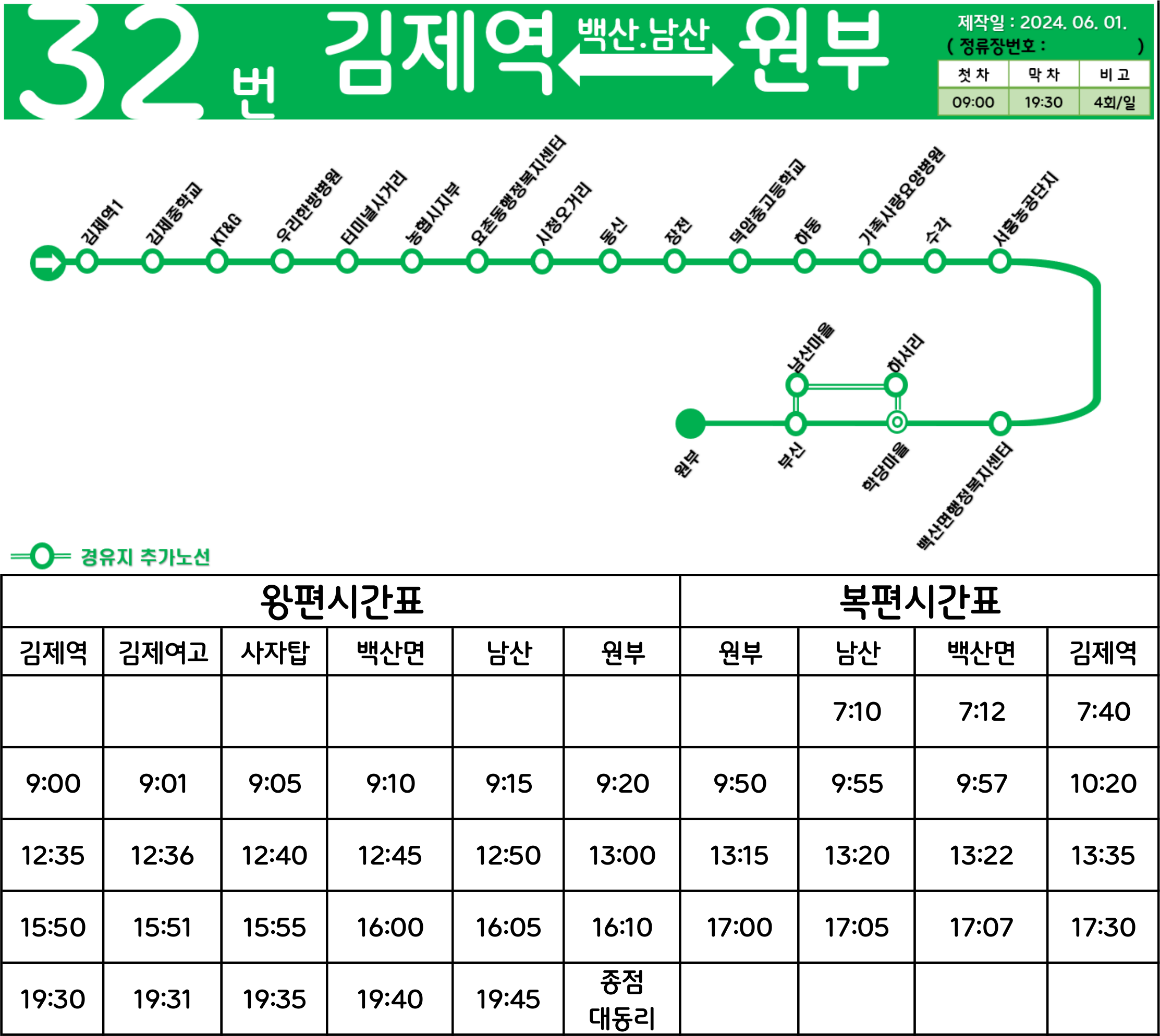 김제 32번: 김제역 ↔ (→ 터미널사거리 → 김제우체국 →/← 김제고 ← 김제농생명마이스터고 ← 구산사거리 ← 시장통 ←) ↔ 동신아파트 ↔ 덕암중.고교 ↔ 학당(백산면사무소) ↔ 백산교회 ↔ 남산 ↔ 부신 ↔ (원부)(부창 ↔ 소동 ↔ 대동)