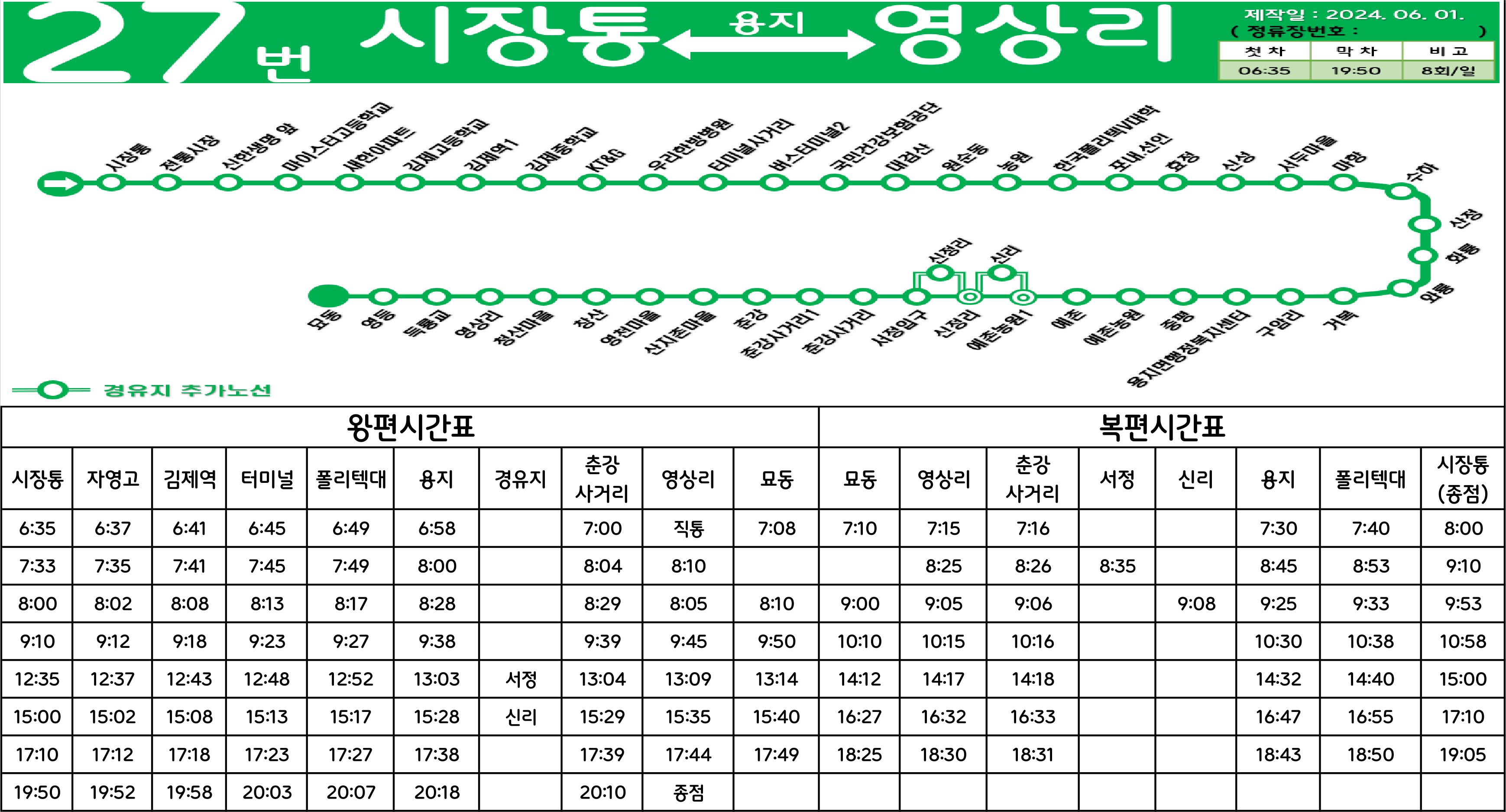 김제 27번: 시장통 ↔ (→ 구산사거리 → 김제농생명마이스터고 → 김제고 → 김제역 → 터미널사거리 →/← 김제우체국 ←) ↔ 김제공용버스터미널 ↔ 대검산 ↔ 한국폴리텍대학 ↔ 점촌사거리 ↔ 수하 ↔ 와룡 ↔ 용지면사무소 ↔ 예촌리 ↔ (신리) ↔ 서정입구 ↔ (서정) ↔ 춘강사거리 ↔ 영천 ↔ 청산 ↔ 득자 ↔ (영등 ↔ 묘동)