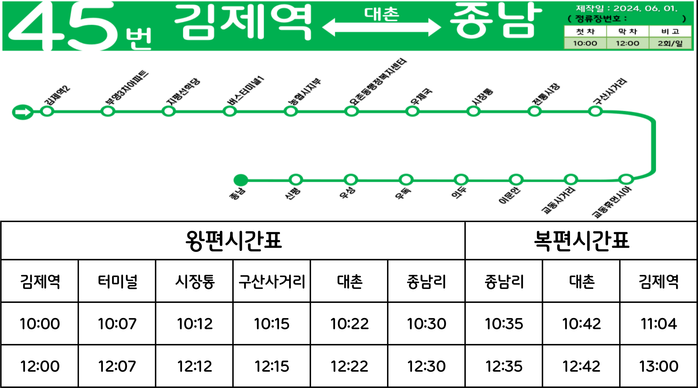 김제 45번: 김제역 ↔ 부영3차아파트 ↔ 김제공용버스터미널 ↔ 시청사거리 ↔ 시장통 ↔ 구산사거리 ↔ 교동휴먼시아 ↔ 후신 ↔ 방죽안 ↔ 복죽동.신평 ↔ 종남