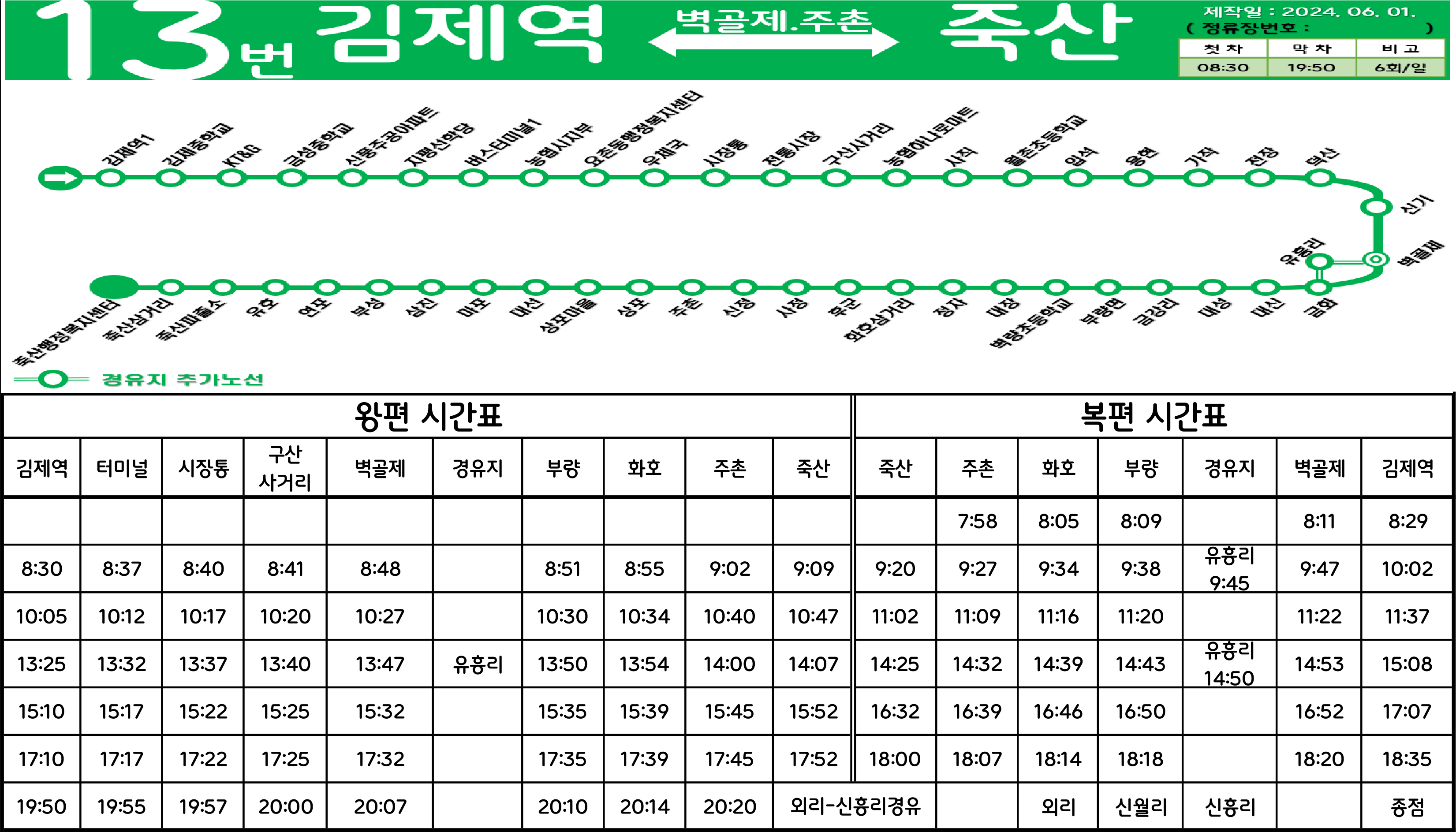 김제 13번: 김제역 ↔ (→ 신풍주공아파트 → 김제종합고속시외버스터미널 → 김제우체국 → 시장통 →/← 김제고 ← 김제농생명마이스터고 ←) ↔ 구산사거리 ↔ 중앙병원 ↔ 입석 ↔ 전장 ↔ 벽골제 ↔ (유흥) ↔ 부량면사무소 ↔ 화호삼거리 ↔ 사정 ↔ 주촌 ↔ 부성 ↔ 유호 ↔ 죽산삼거리