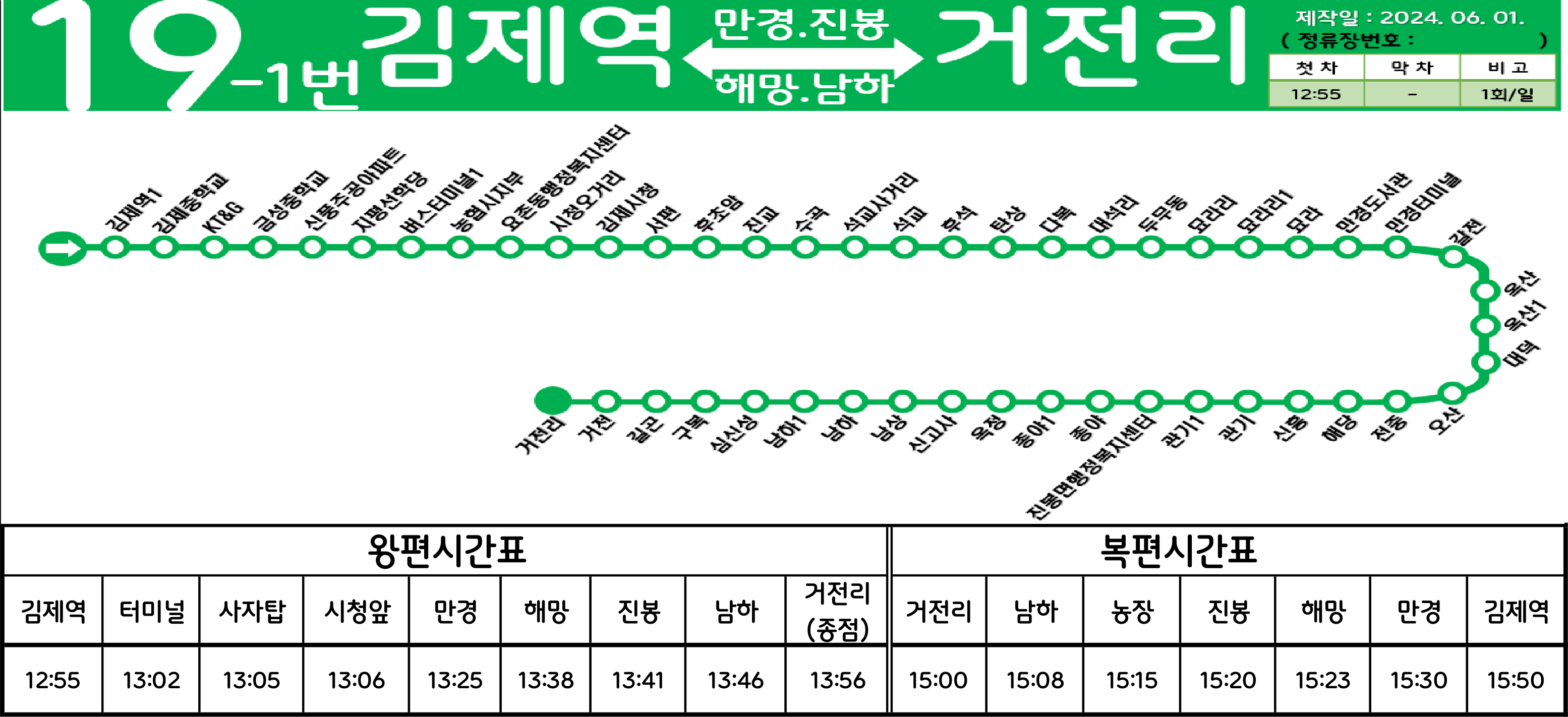 김제 19-1번: 김제역 → KT&G → 신풍주공아파트 → 김제종합고속시외버스터미널 → 김제우체국 → 김제시청 →진교 → 석교 → 탄상(서김제IC) → 대석리 → 묘라 → 만경삼거리 → 만경터미널 → 해망 → 관기(진봉면사무소) → 종야 → 농장 → 옥정 → 남하 → 길곤 → 거전