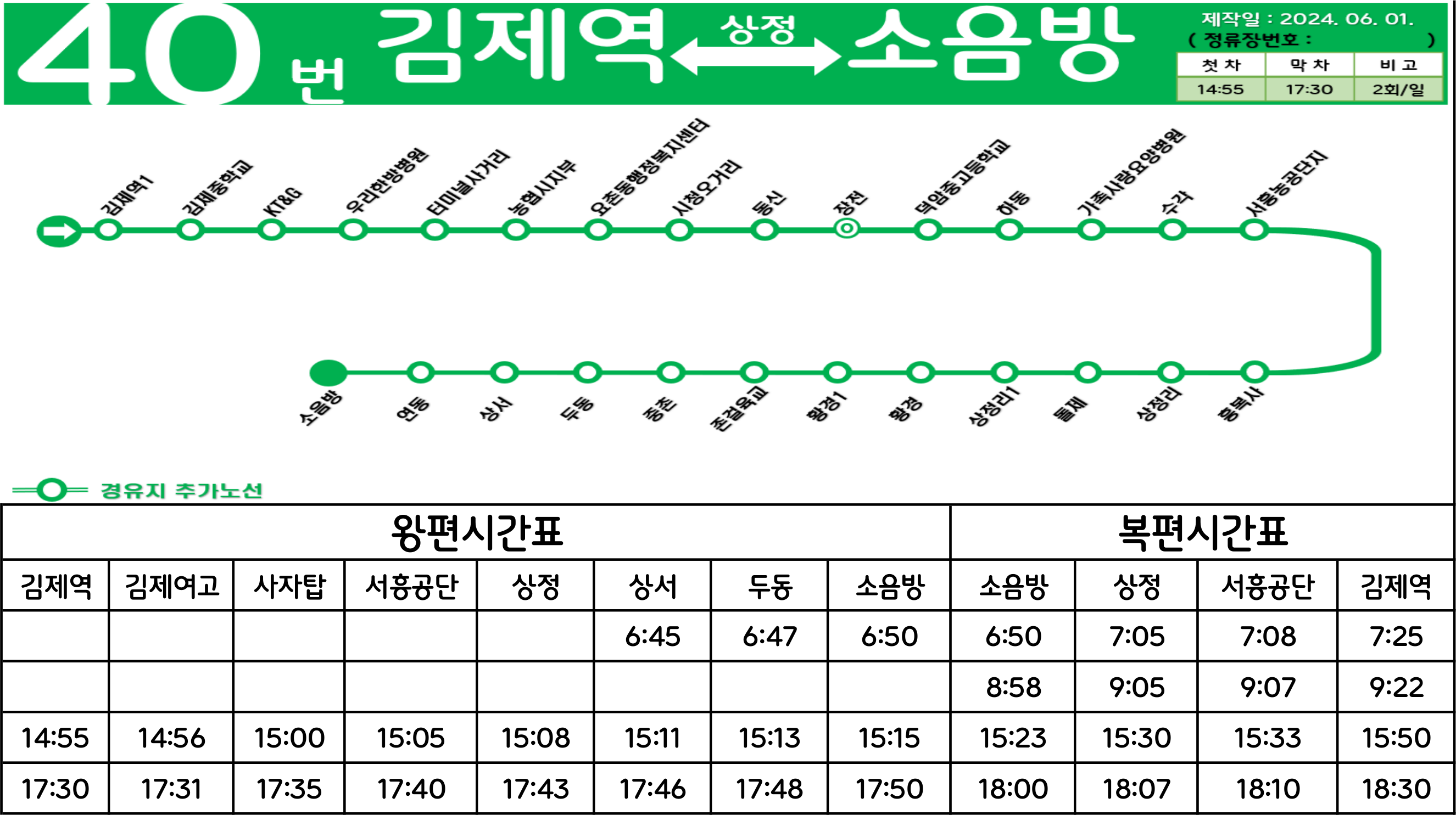 김제 40번: 김제역 ↔ (→ 터미널사거리 → 김제우체국 →/← 김제고 ← 김제농생명마이스터고 ← 구산사거리 ← 시장통 ←) ↔ 동신아파트 ↔ 덕암중.고교 ↔ 서흥농공단지 ↔ 상정 ↔ 황경 ↔ 중촌입구 → 두동 → 중촌 → 상서종점 → 상서 → 연동경로당 → 소음방