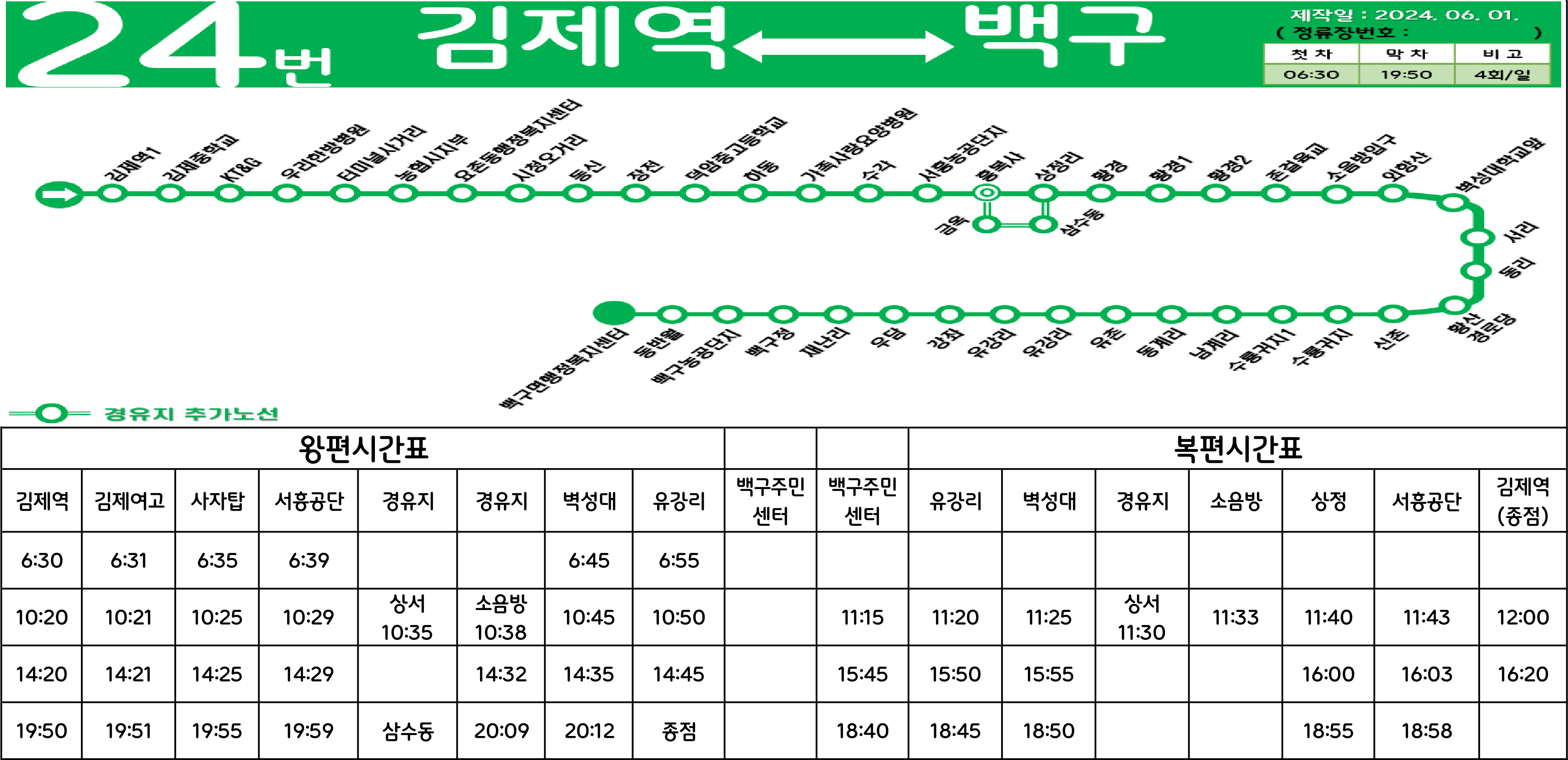 김제 24번: 김제역 ↔ (→ 터미널사거리 → 김제우체국 →/← 김제고 ← 김제농생명마이스터고 ← 구산사거리 ← 시장통 ←) ↔ 동신아파트 ↔ 덕암중.고교 ↔ 서흥농공단지 ↔ 상정리 ↔ 황경 ↔ (← 존걸육교 ← 성리 ← 소음방 ← 연동 ← 상서 ← 중촌 ← 성리 ←) ↔ 존걸육교 ↔ 벽성대학 ↔ 황산경로당 ↔ 신촌 ↔ 율포 ↔ 유강리종점 ↔ 백구