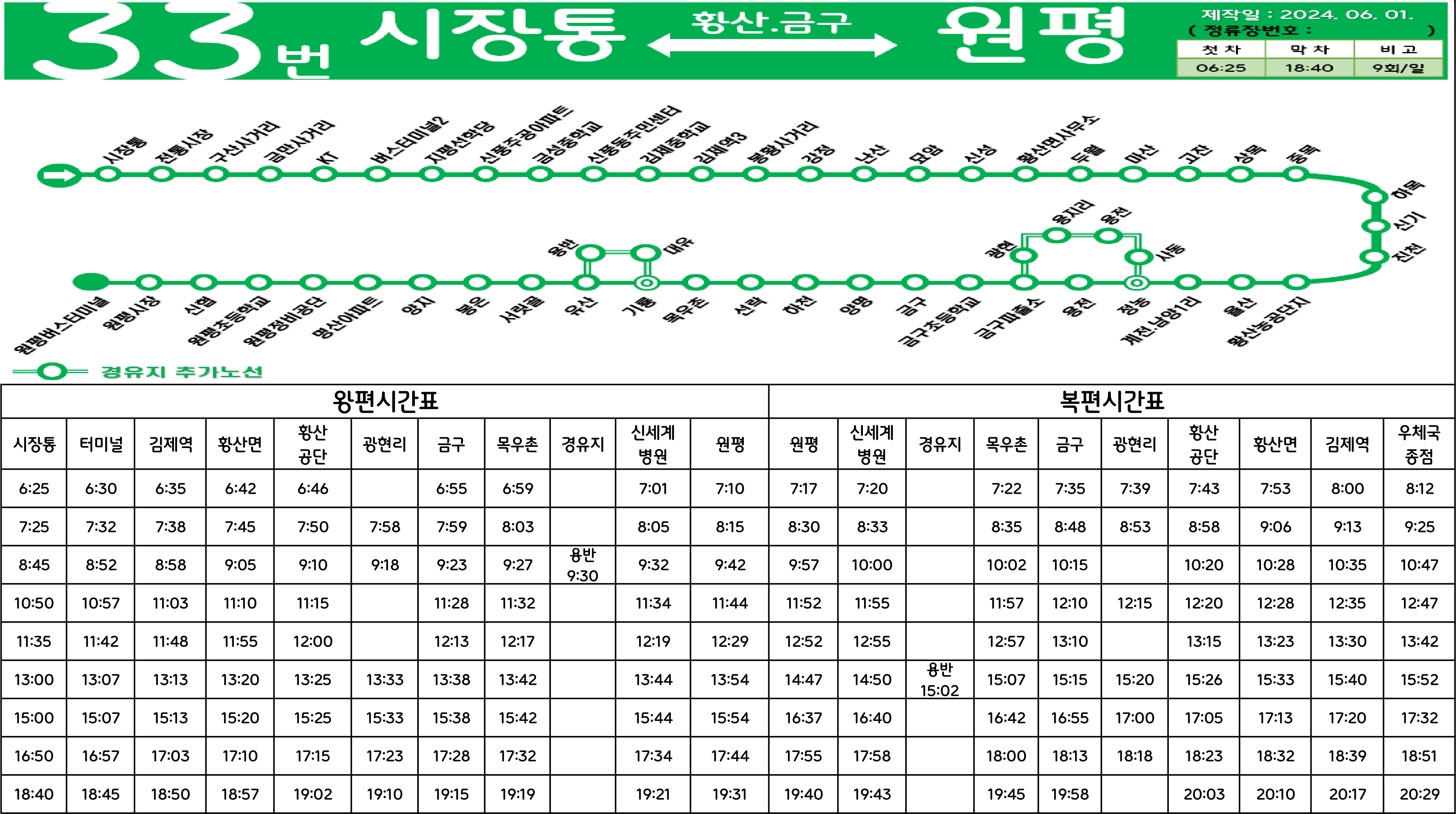 김제 33번: 시장통 ↔ (→ 구산사거리 → 김제공용버스터미널 → 지평선학당 →/← 김제우체국 ← 김제전화국 ← 김제시립도서관 ←) ↔ KT&G ↔ 김제역 ↔ 봉황사거리 ↔ 난산 ↔ 황산면사무소 ↔ 상목 ↔ 황산농공단지 ↔ 옥사동 ↔ (사동.배양골 ↔ 광현 ↔ 우산리) ↔ 금구 ↔ 금구면사무소 ↔ 하천 ↔ 기룡 ↔ (용반) ↔ 봉은 ↔ 낙수동 ↔ 명산아파트 ↔ 원평버스터미널