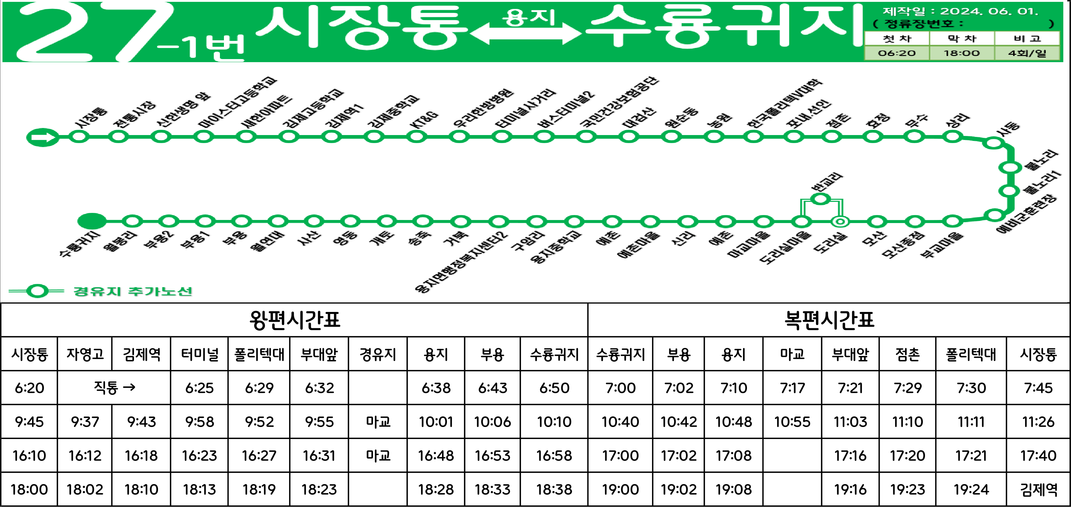 김제 27-1번: 시장통 ↔ (→ 구산사거리 → 김제농생명마이스터고 → 김제고 → 김제역 → 터미널사거리 →/← 김제우체국 ←) ↔ 김제공용버스터미널 ↔ 대검산 ↔ 한국폴리텍대학 ↔ 점촌사거리 ↔ 불노리사거리 ↔ 모산종점 ↔ 도리실 ↔ (반교리.마교) ↔ 용지면사무소 ↔ 월봉 ↔ 부용역 ↔ 수룡귀지