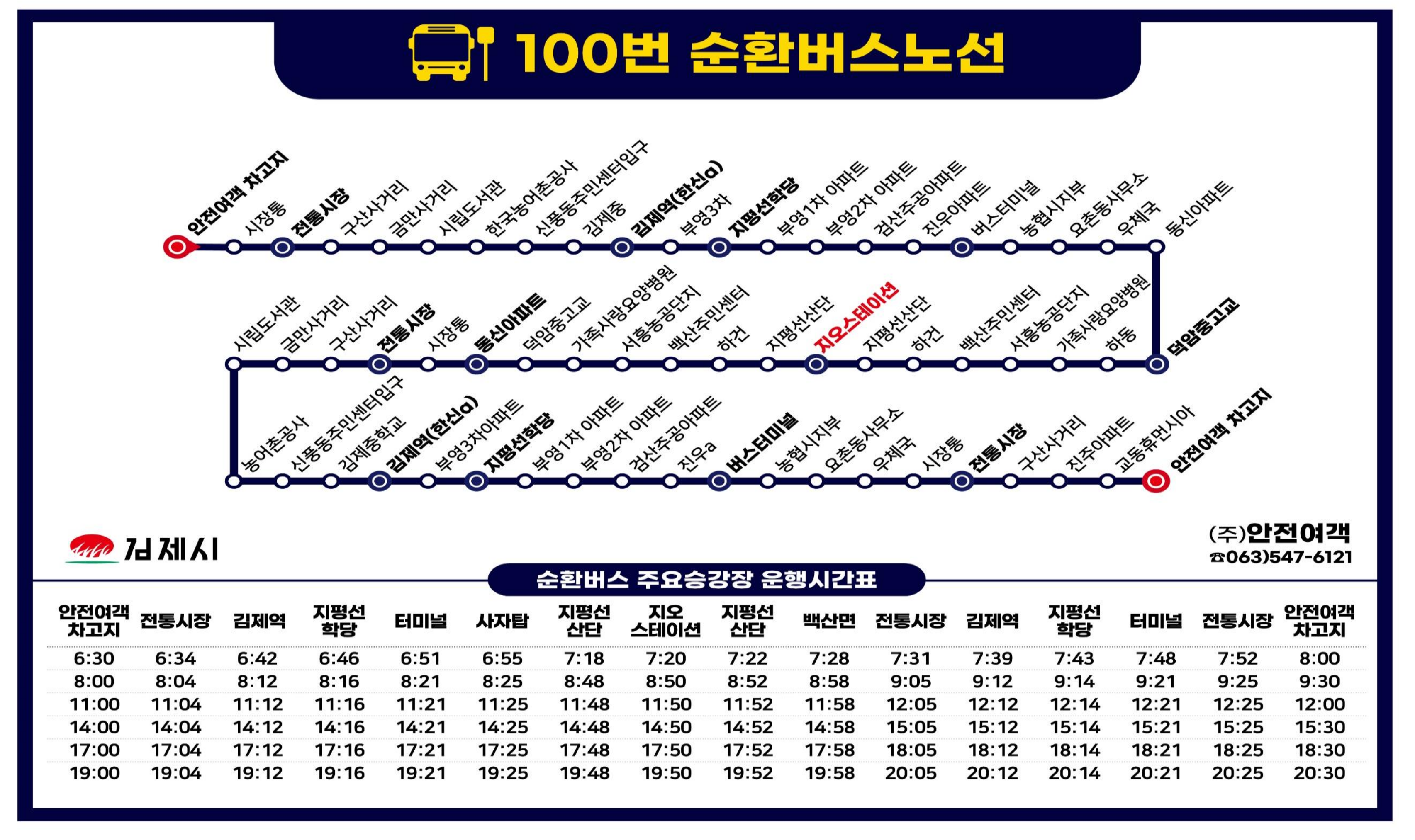 김제 50번: 시장통 ↔ (→ 구산사거리 → 김제공용버스터미널 → 신풍주공아파트 →/← 김제우체국 ← 터미널사거리 ←) ↔ 김제역 ↔ 부영3차아파트 ↔ 검산휴먼시아 ↔ 황산면사무소 ↔ 연리 ↔ 백일 ↔ 남주(봉남면사무소) ↔ 송내 ↔ 신성 ↔ 금구 ↔ (선암저수지 ↔ 축령.싸리재)