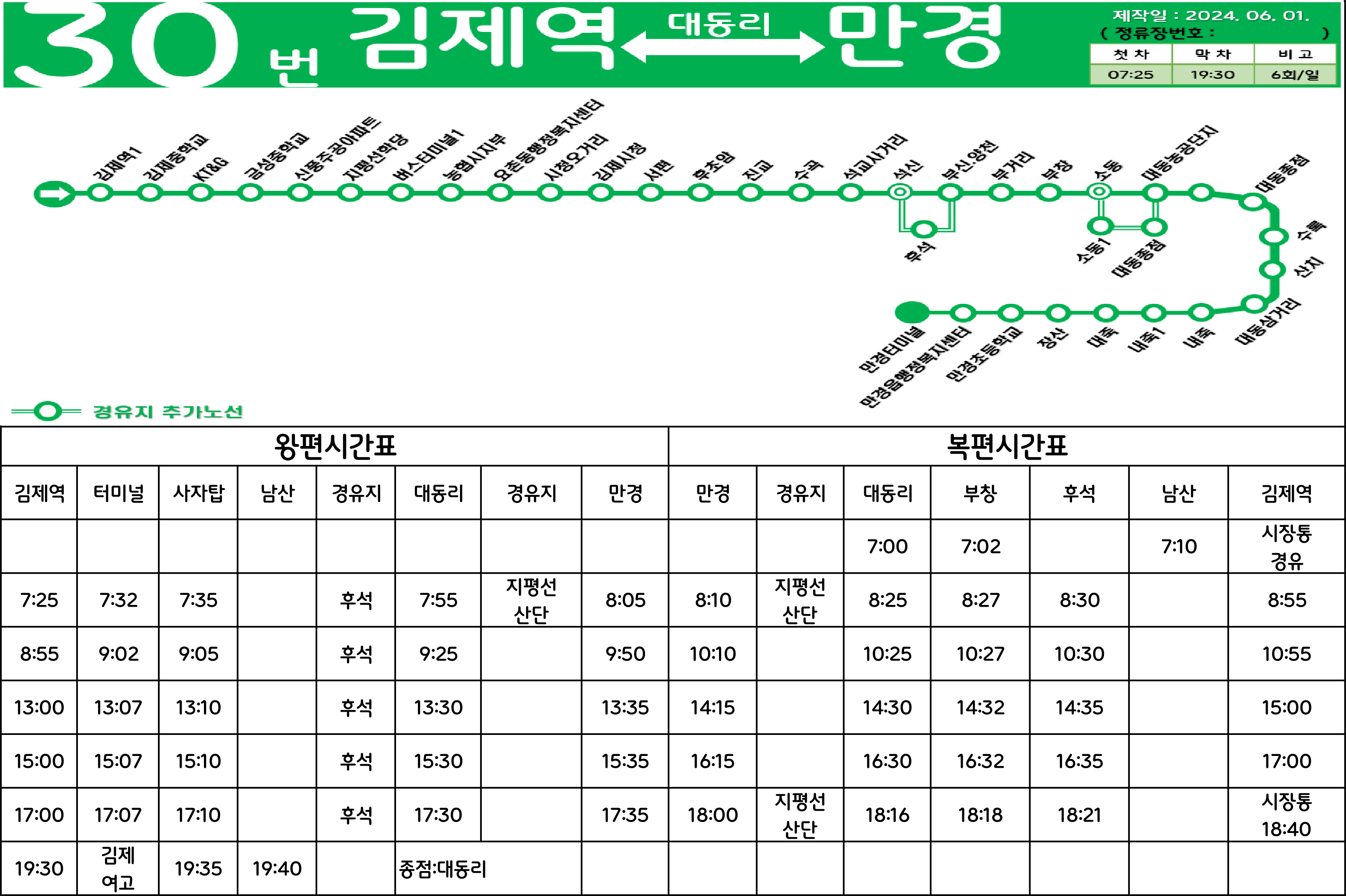김제 30번: 김제역 ↔ (→ 금성여중 → 지평선학당 → 김제공용버스터미널 → 김제우체국 → 김제시청 →/← 김제고 ← 김제농생명마이스터고 ← 진주아파트 ← 금성상회 ← 성산공원 ←) ↔ 수곡 ↔ 석교 ↔ 전북유아교육진흥원 ↔ (남산) ↔ 부창 ↔ 소동 ↔ 대동 ↔ 소동 ↔ (지평선산업단지) ↔ 대동농공단지 ↔ 산치 ↔ 내죽 ↔ 만경초교 ↔ 만경시장 ↔ 만경터미널