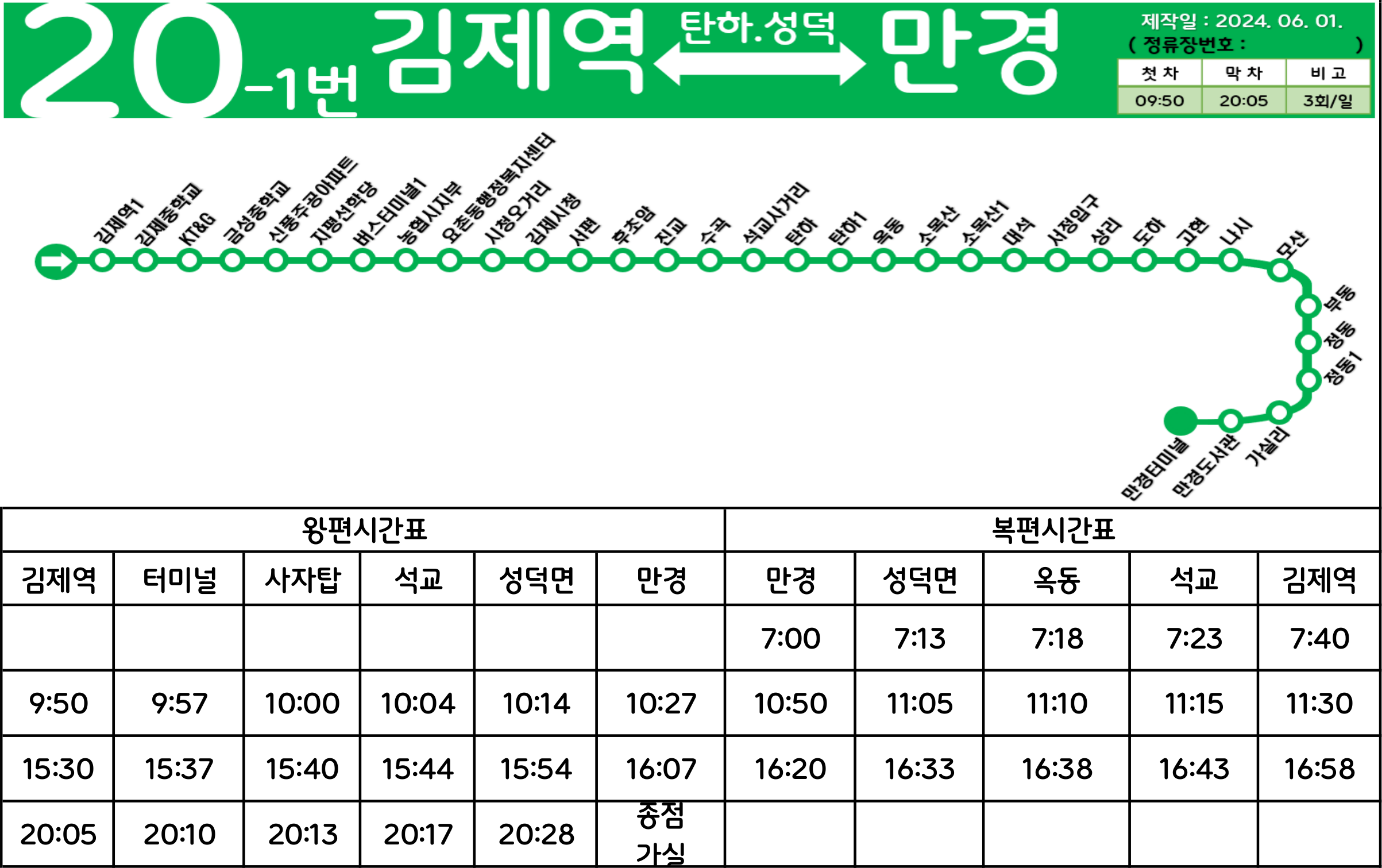 김제 20-1번: 김제역 ↔ (→ KT&G → 신풍주공아파트 → 김제공용버스터미널 → 김제우체국 → 김제시청 →/← 김제고 ← 김제농생명마이스터고 ← 진주아파트 ← 금성상회 ← 성산공원 ←) ↔ 진교 ↔ 석교 ↔ (→ 탄상 → 다복 → 대목산 → 옥동 →/← 탄하 ← 소목산 ←) ↔ 대석 ↔ 성덕초교 ↔ 상리(성덕면사무소) ↔ 도하 ↔ 고현 ↔ 나시 ↔ 정동 ↔ 원가실 ↔ 만경삼거리 ↔ 만경터미널