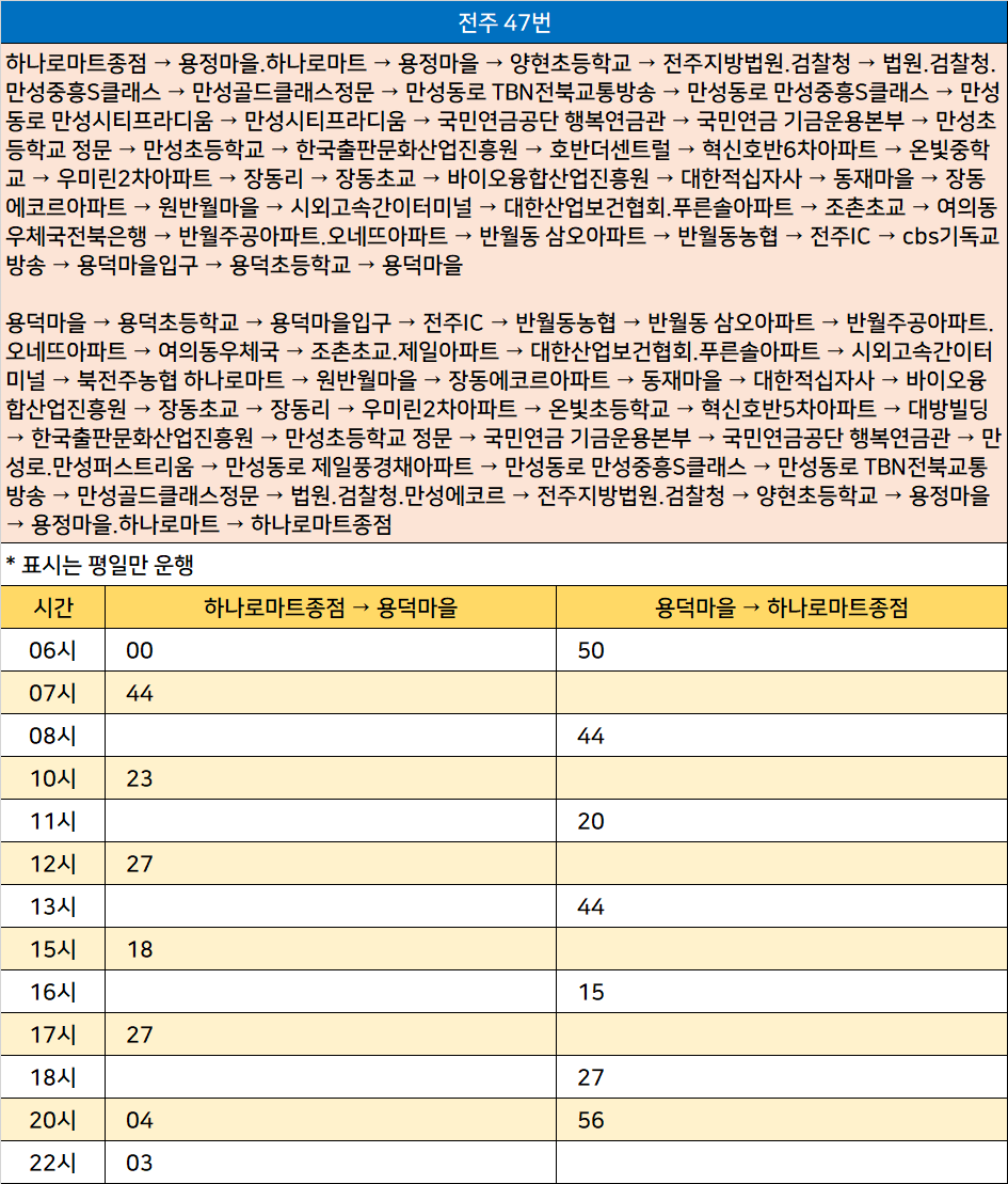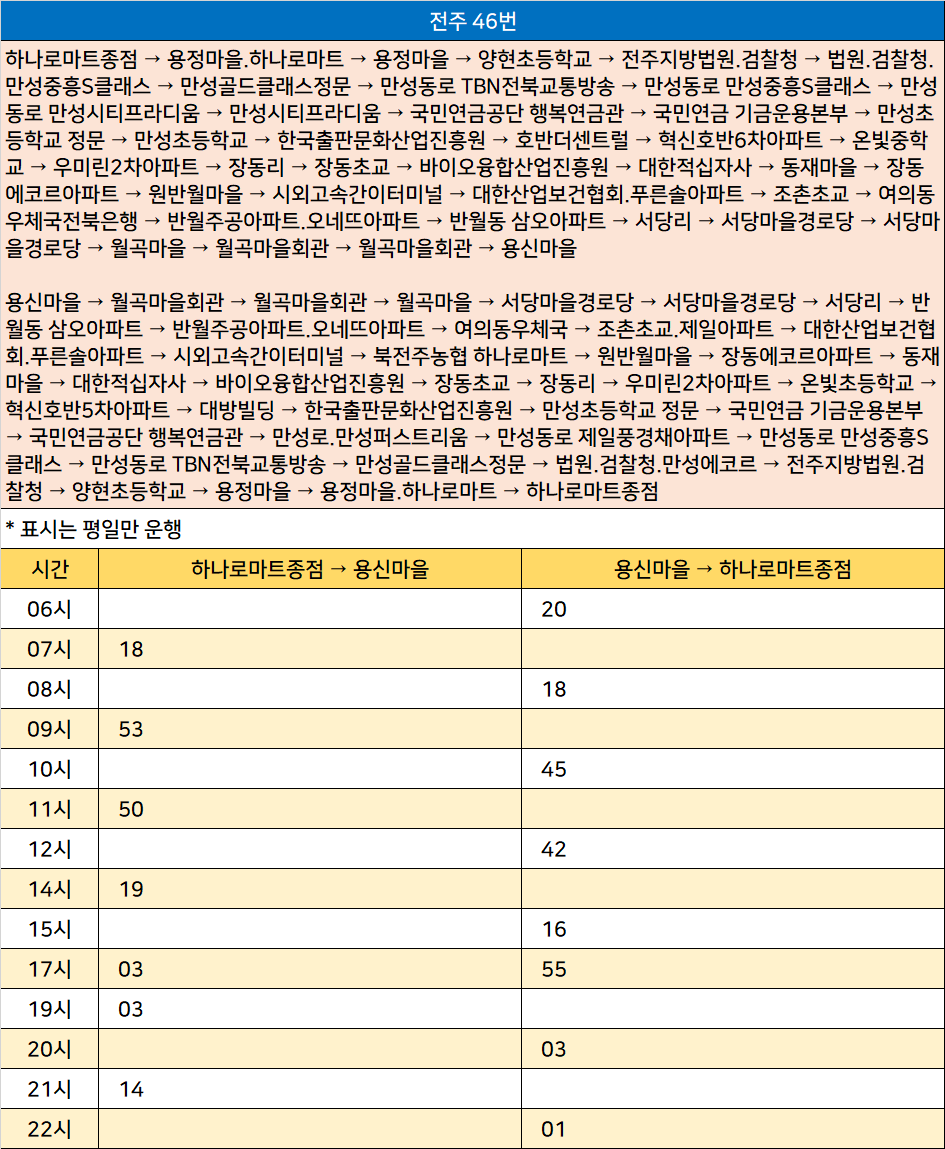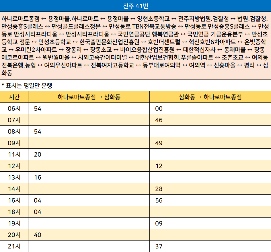 전주 41번: 하나로마트종점 ↔ 용정마을.하나로마트 ↔ 용정마을 ↔ 양현초등 ↔ 전주지방법원.검찰청 ↔ 법원.검찰청.만성중흥S클래스 ↔ 만성골드클래스정문 ↔ 만성동로 TBN전북교통방송 ↔ 만성동로 만성중흥S클래스 ↔ 만성동로 만성시티프라디움 ↔ 만성시티프라디움 ↔ 국민연금공단 행복연금관 ↔ 국민연금 기금운용본부 ↔ 만성초등 정문 ↔ 만성초등 ↔ 한국출판문화산업진흥원 ↔ 호반더센트럴 ↔ 혁신호반6차A ↔ 온빛중 ↔ 우미린2차A ↔ 장동리 ↔ 장동초교 ↔ 바이오융합산업진흥원 ↔ 대한적십자사 ↔ 동재마을 ↔ 장동에코르A ↔ 원반월마을 ↔ 시외고속간이터미널 ↔ 대한산업보건협회.푸른솔A ↔ 조촌초교 ↔ 여의동전북은행.농협 ↔ 여의우신A ↔ 전북여자고등 ↔ 동부대로여의역 ↔ 여의역 ↔ 신흥마을 ↔ 평리 ↔ 삼화동