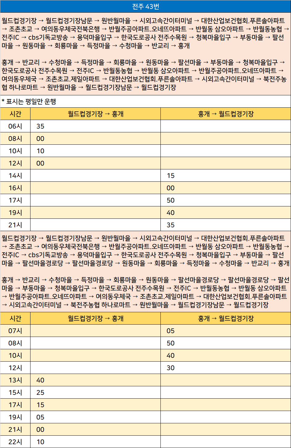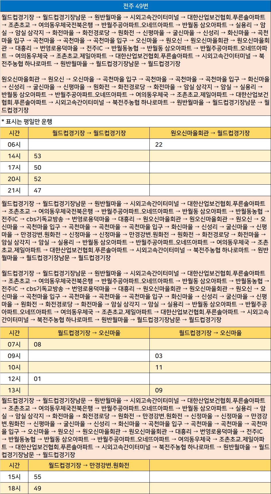월드컵경기장 ↔ 월드컵경기장남문 ↔ 원반월마을 ↔ 시외고속간이터미널 ↔ 대한산업보건협회.푸른솔A ↔ 조촌초교 ↔ 여의동우체국전북은행 ↔ 반월주공A.오네뜨A ↔ 반월동 삼오A ↔ 반월동농협 ↔ 전주IC ↔ cbs기독교방송 ↔ 번영로용덕마을 ↔ 대흥리 ↔ 성덕 ↔ 이작마을 ↔ 도도리 ↔ 항공대대 ↔ 도도리 ↔ 동계 ↔ 신유강 ↔ 고잔
