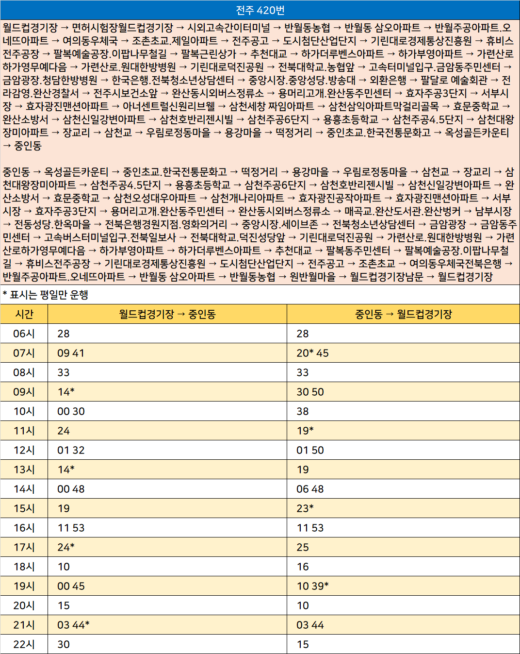춘강 → 산지촌마을 → 영천마을 → 난산초교 → 득자마을 → 득룡교 → 남정리 → 매암마을 → 성덕 → 대흥리 → 칠정경로당 → 칠정경로당 → 번영로용덕마을 → 전주IC → 반월동농협 → 반월동 삼오A → 반월주공A.오네뜨A → 여의동우체국 → 조촌초교.제일A → 대한산업보건협회.푸른솔A → 시외고속간이터미널 → 북전주농협 하나로마트 → 원반월마을 → 월드컵경기장남문 → 월드컵경기장
