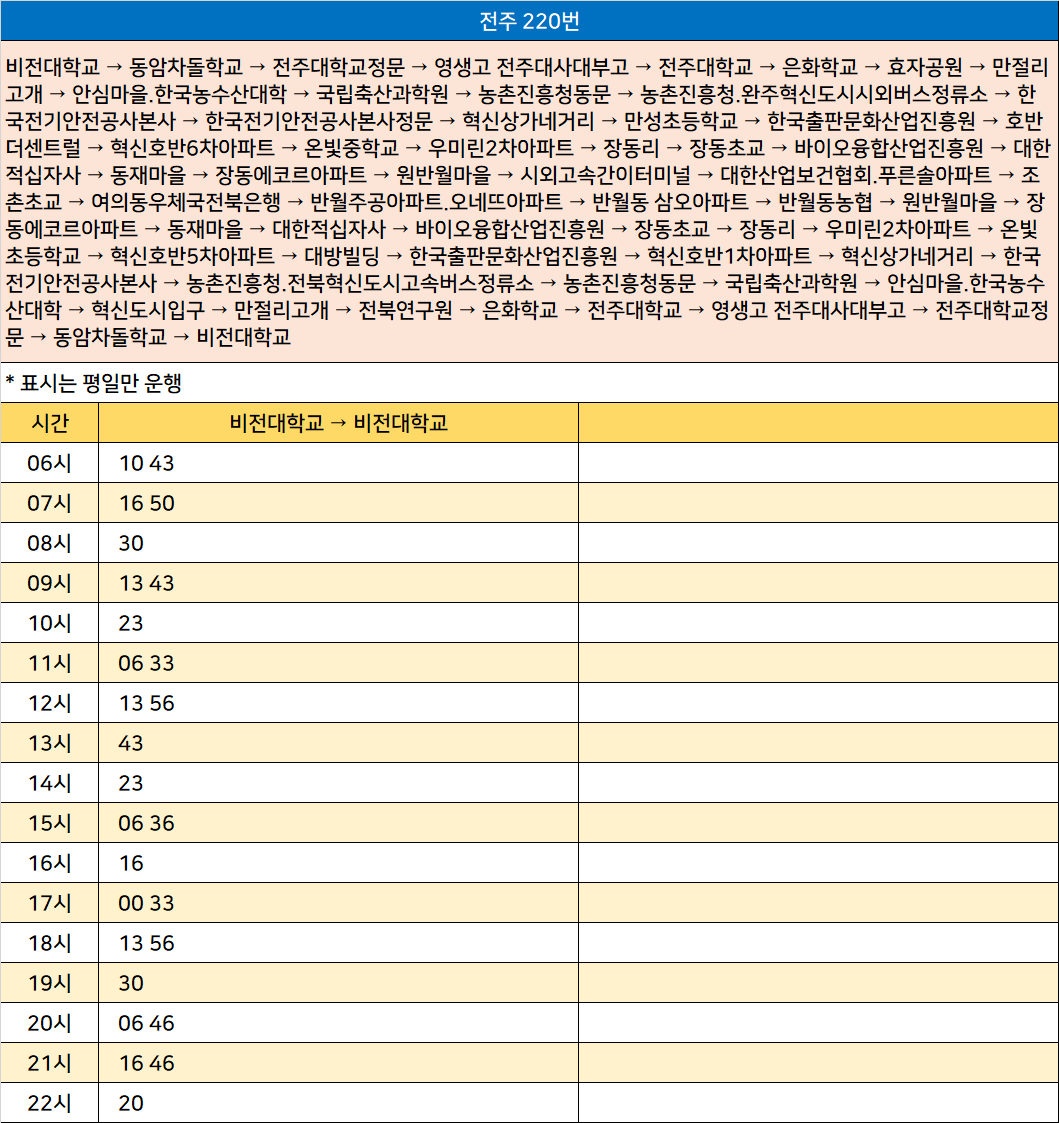 전주 220번: 비전대 → 동암차돌학교 → 전주대정문 → 영생고 전주대사대부고 → 전주대 → 은화학교 → 효자공원 → 만절리고개 → 안심마을.한국농수산대학 → 국립축산과학원 → 농촌진흥청동문 → 농촌진흥청.완주혁신도시시외정류소 → 한국전기안전공사본사 → 한국전기안전공사본사정문 → 혁신상가네거리 → 만성초등학교 → 한국출판문화산업진흥원 → 호반더센트럴 → 혁신호반6차A → 온빛중학교 → 우미린2차A → 장동리 → 장동초교 → 바이오융합산업진흥원 → 대한적십자사 → 동재마을 → 장동에코르A → 원반월마을 → 시외고속간이터미널 → 대한산업보건협회.푸른솔A → 조촌초교 → 여의동우체국전북은행 → 반월주공A.오네뜨A → 반월동 삼오A → 반월동농협 → 원반월마을 → 장동에코르A → 동재마을 → 대한적십자사 → 바이오융합산업진흥원 → 장동초교 → 장동리 → 우미린2차A → 온빛초등학교 → 혁신호반5차A → 대방빌딩 → 한국출판문화산업진흥원 → 혁신호반1차A → 혁신상가네거리 → 한국전기안전공사본사 → 농촌진흥청.전북혁신도시고속버스정류소 → 농촌진흥청동문 → 국립축산과학원 → 안심마을.한국농수산대학 → 혁신도시 → 만절리고개 → 전북연구원 → 은화학교 → 전주대 → 영생고 전주대사대부고 → 전주대정문 → 동암차돌학교 → 비전대